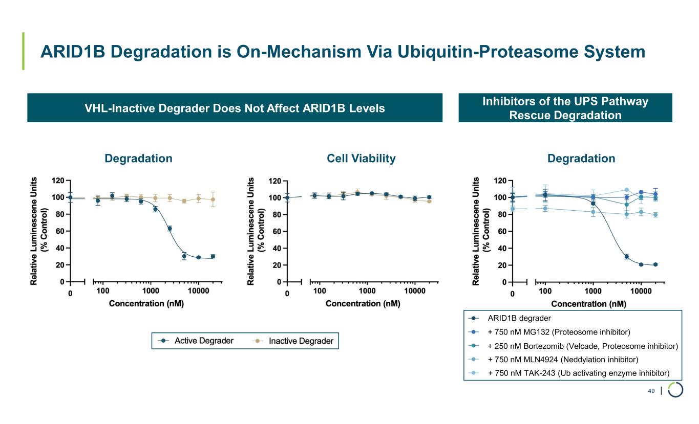 | ARID1B Degradation is On-Mechanism Via Ubiquitin-Proteasome System 49 Inhibitors of the UPS Pathway Rescue Degradation VHL-Inactive Degrader Does Not Affect ARID1B Levels Degradation Cell Viability Degradation + 750 nM MG132 (Proteosome inhibitor) + 250 nM Bortezomib (Velcade, Proteosome inhibitor) + 750 nM MLN4924 (Neddylation inhibitor) + 750 nM TAK-243 (Ub activating enzyme inhibitor) ARID1B degrader