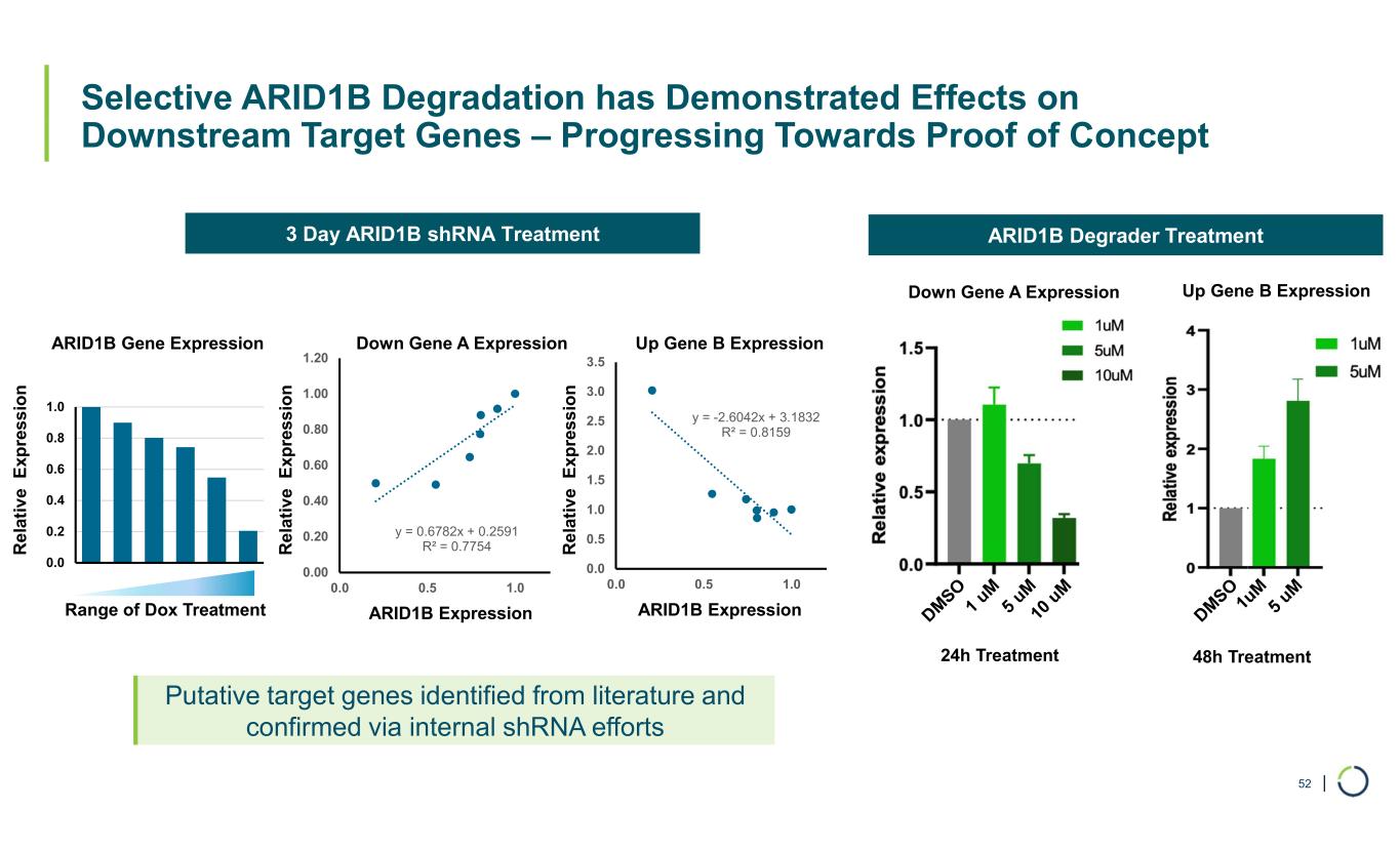 | 0.0 0.2 0.4 0.6 0.8 1.0 1 2 3 4 5 6 Selective ARID1B Degradation has Demonstrated Effects on Downstream Target Genes – Progressing Towards Proof of Concept 52 3 Day ARID1B shRNA Treatment ARID1B Degrader Treatment y = 0.6782x + 0.2591 R² = 0.7754 0.00 0.20 0.40 0.60 0.80 1.00 1.20 0.0 0.5 1.0 ARID1B expression y = -2.6042x + 3.1832 R² = 0.8159 0.0 0.5 1.0 1.5 2.0 2.5 3.0 3.5 0.0 0.5 1.0 ARID1B expression ARID1B Gene Expression ARID1B Expression ARID1B ExpressionRange of Dox Treatment R e la ti v e E xp re ss io n R e la ti v e E xp re ss io n R e la ti v e E xp re ss io n Down Gene A Expression Up Gene B Expression 24h Treatment 48h Treatment Down Gene A Expression Up Gene B Expression Putative target genes identified from literature and confirmed via internal shRNA efforts