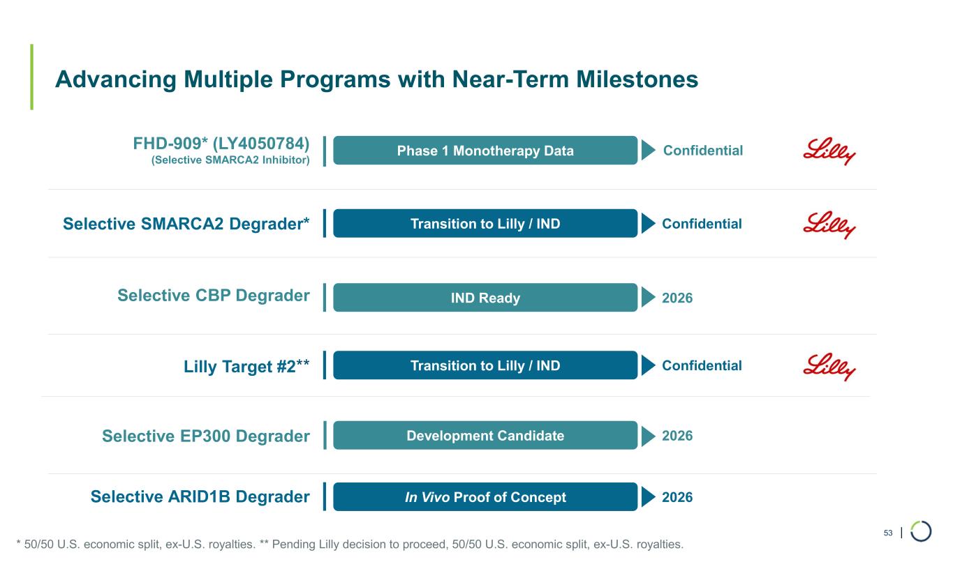 | Advancing Multiple Programs with Near-Term Milestones 53 Phase 1 Monotherapy DataFHD-909* (LY4050784) (Selective SMARCA2 Inhibitor) 2026IND Ready Selective CBP Degrader 2026Development CandidateSelective EP300 Degrader ConfidentialTransition to Lilly / INDSelective SMARCA2 Degrader* ConfidentialTransition to Lilly / INDLilly Target #2** 2026In Vivo Proof of ConceptSelective ARID1B Degrader * 50/50 U.S. economic split, ex-U.S. royalties. ** Pending Lilly decision to proceed, 50/50 U.S. economic split, ex-U.S. royalties. Confidential