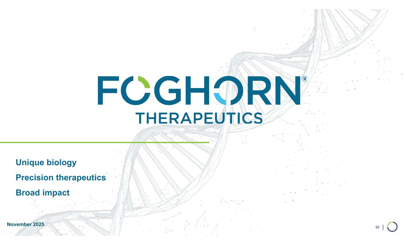 | Developing First-in-Class Precision Medicines Targeting Major Unmet Needs in Cancer 54 Large Market Potential Chromatin biology is implicated in up to 50% of tumors, potentially impacting ~2.5 million patients Foghorn’s current pipeline potentially addresses more than 500,000 of these patients Broad pipeline across a range of targets and small molecule modalities Major Strategic Collaboration Strategic collaboration with Lilly; $380 million upfront; 50/50 U.S. economic split on two lead programs Well- Funded $180.3 million in cash and equivalents (as of 09/30/2025) Cash runway into 2028 Shares outstanding: approximately 63.0M* Value Drivers Selective SMARCA2 Inhibitor, FHD-909, partnered with Lilly, in Phase 1 trial Advancement of preclinical assets (Selective SMARCA2, CBP, EP300, ARID1B Degraders) towards INDs Protein degrader platform with expansion into induced proximity Leader in Unique Area of Cancer Biology Foghorn is a leader in targeting chromatin biology, which has the potential to address underlying dependencies of many genetically defined cancers Platform with initial focus in oncology, therapeutic area expansion potential *Includes common shares outstanding and pre-funded warrants as of 09/30/2025.
