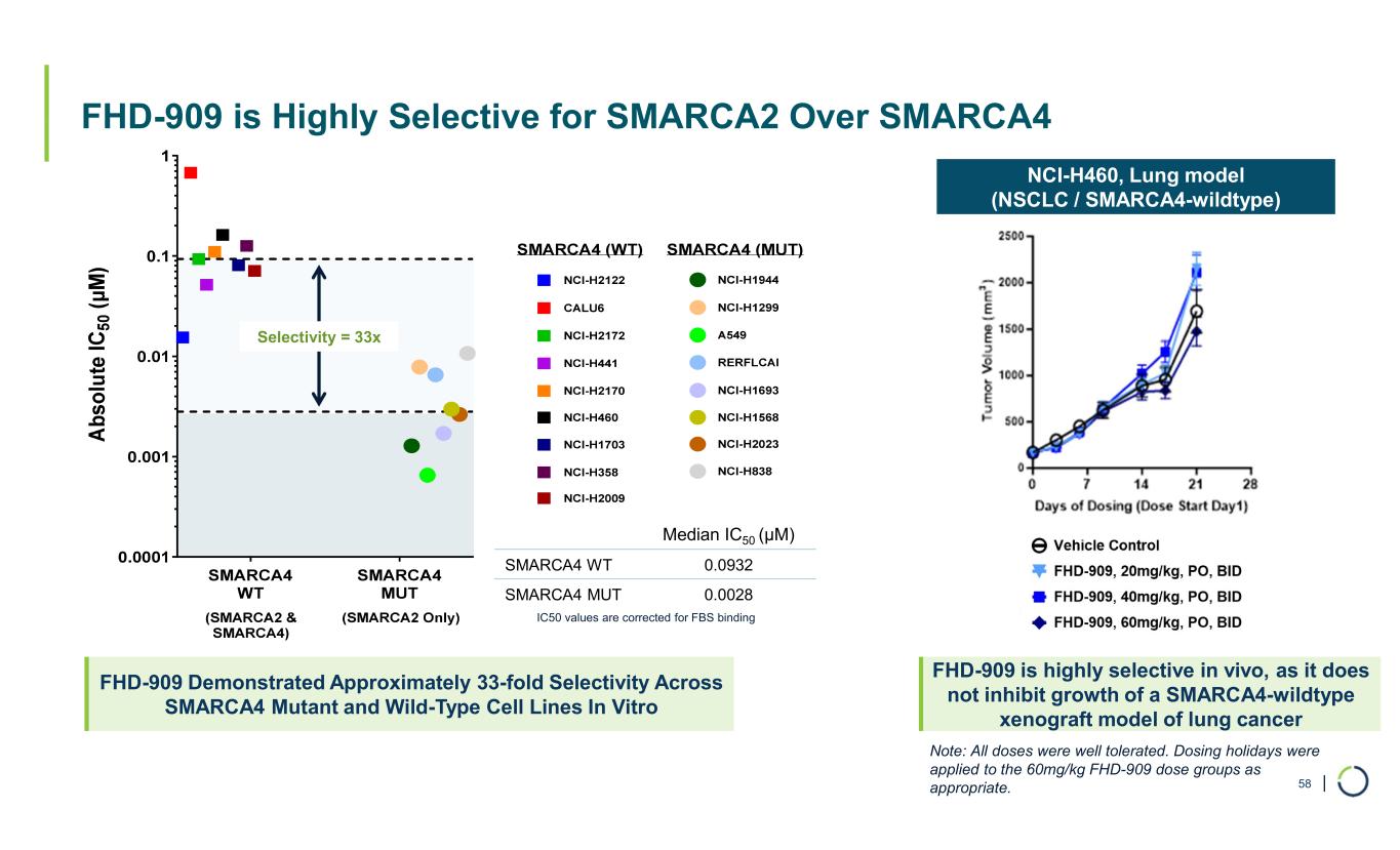 | FHD-909 is Highly Selective for SMARCA2 Over SMARCA4 58 FHD-909 Demonstrated Approximately 33-fold Selectivity Across SMARCA4 Mutant and Wild-Type Cell Lines In Vitro Selectivity = 33x Median IC50 (µM) 0.0932SMARCA4 WT 0.0028SMARCA4 MUT NCI-H460, Lung model (NSCLC / SMARCA4-wildtype) FHD-909 is highly selective in vivo, as it does not inhibit growth of a SMARCA4-wildtype xenograft model of lung cancer IC50 values are corrected for FBS binding Note: All doses were well tolerated. Dosing holidays were applied to the 60mg/kg FHD-909 dose groups as appropriate.