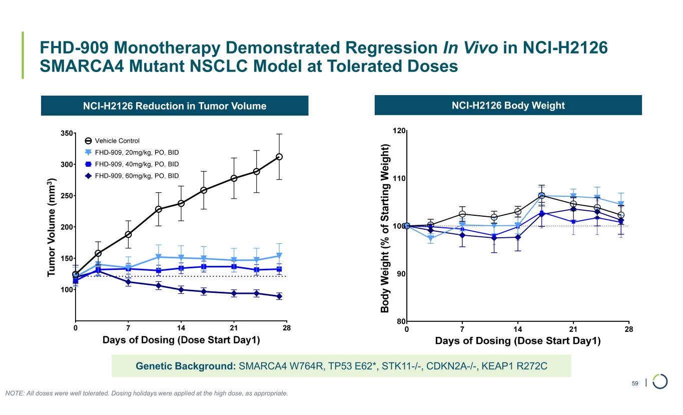| FHD-909 Monotherapy Demonstrated Regression In Vivo in NCI-H2126 SMARCA4 Mutant NSCLC Model at Tolerated Doses 59 NCI-H2126 Reduction in Tumor Volume NCI-H2126 Body Weight Genetic Background: SMARCA4 W764R, TP53 E62*, STK11-/-, CDKN2A-/-, KEAP1 R272C NOTE: All doses were well tolerated. Dosing holidays were applied at the high dose, as appropriate. T u m o r vo lu m e (m m 3 ) Tu m o r V o lu m e (m m 3 )