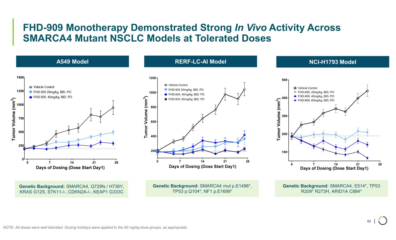 | FHD-909 Monotherapy Demonstrated Strong In Vivo Activity Across SMARCA4 Mutant NSCLC Models at Tolerated Doses 60 0 7 14 21 28 100 200 300 400 500 Days of Dosing (Dose Start Day1) Vehicle Control FHD-909, 20mg/kg, BID, PO FHD-909, 40mg/kg, BID, PO FHD-909, 60mg/kg, BID, PO A549 Model RERF-LC-AI Model NCI-H1793 Model Genetic Background: SMARCA4, Q729fs / H736Y, KRAS G12S, STK11-/-, CDKN2A-/-, KEAP1 G333C Genetic Background: SMARCA4 mut p.E1496*, TP53 p.Q104*, NF1 p.E1699* Genetic Background: SMARCA4, E514*, TP53 R209* R273H, ARID1A C884* NOTE: All doses were well tolerated. Dosing holidays were applied to the 60 mg/kg dose groups, as appropriate.
