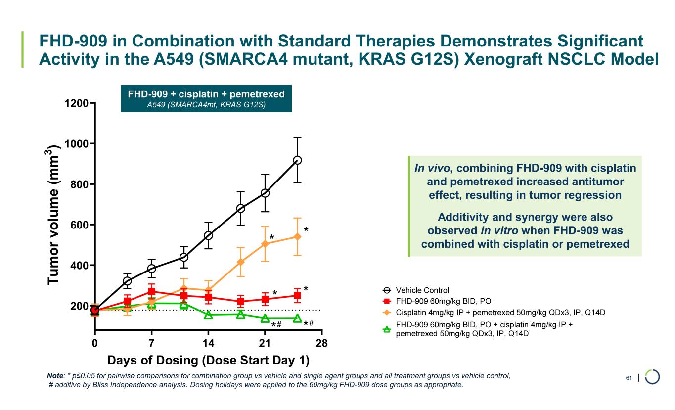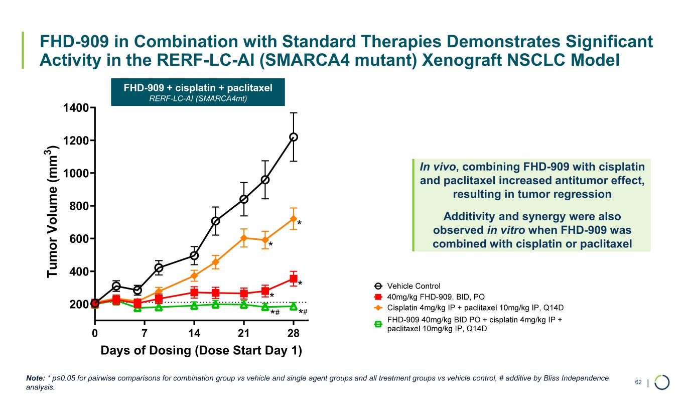 | FHD-909 in Combination with Standard Therapies Demonstrates Significant Activity in the A549 (SMARCA4 mutant, KRAS G12S) Xenograft NSCLC Model 61 0 7 14 21 28 200 400 600 800 1000 1200 Days of Dosing (Dose Start Day 1) T u m o r vo lu m e (m m 3 ) * * * * ** ## Note: * p≤0.05 for pairwise comparisons for combination group vs vehicle and single agent groups and all treatment groups vs vehicle control, # additive by Bliss Independence analysis. Dosing holidays were applied to the 60mg/kg FHD-909 dose groups as appropriate. FHD-909 + cisplatin + pemetrexed A549 (SMARCA4mt, KRAS G12S) In vivo, combining FHD-909 with cisplatin and pemetrexed increased antitumor effect, resulting in tumor regression Additivity and synergy were also observed in vitro when FHD-909 was combined with cisplatin or pemetrexed
