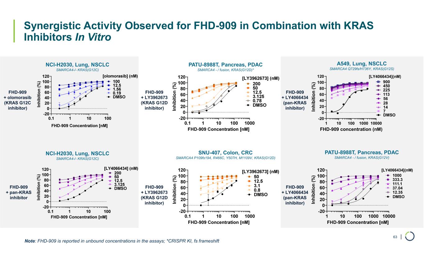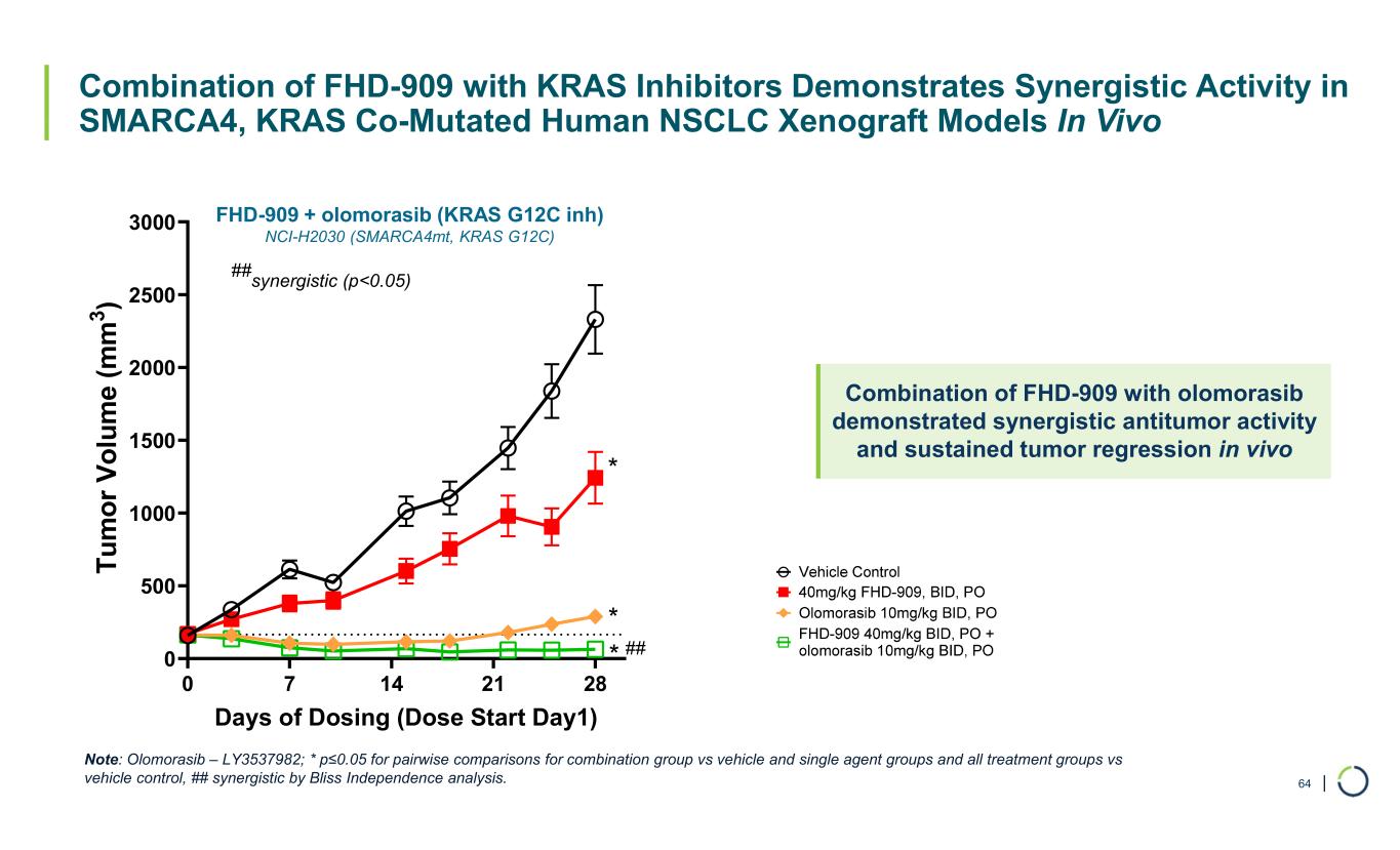 | Synergistic Activity Observed for FHD-909 in Combination with KRAS Inhibitors In Vitro 63 In h ib it io n ( % ) In h ib it io n ( % ) FHD-909 + olomorasib (KRAS G12C inhibitor) FHD-909 + pan-KRAS inhibitor In h ib it io n ( % ) In h ib it io n ( % ) 1 10 100 1000 10000 -20 0 20 40 60 80 100 120 FHD-909 concentration (nM) DMSO 7 14 28 56 113 225 450 900 [LY4066434](nM) In h ib it io n ( % ) NCI-H2030, Lung, NSCLC SMARCA4-/- KRAS(G12C) PATU-8988T, Pancreas, PDAC SMARCA4 - / fusion, KRAS(G12D)* SNU-407, Colon, CRC SMARCA4 P109fs194, R466C, Y507H, M1109V, KRAS(G12D) A549, Lung, NSCLC SMARCA4 Q729fs/H736Y, KRAS(G12S) PATU-8988T, Pancreas, PDAC SMARCA4 - / fusion, KRAS(G12V) Note: FHD-909 is reported in unbound concentrations in the assays; *CRISPR KI, fs frameshift FHD-909 + LY3962673 (KRAS G12D inhibitor) FHD-909 + LY4066434 (pan-KRAS inhibitor) FHD-909 + LY3962673 (KRAS G12D inhibitor) FHD-909 + LY4066434 (pan-KRAS inhibitor) NCI-H2030, Lung, NSCLC SMARCA4-/- KRAS(G12C)