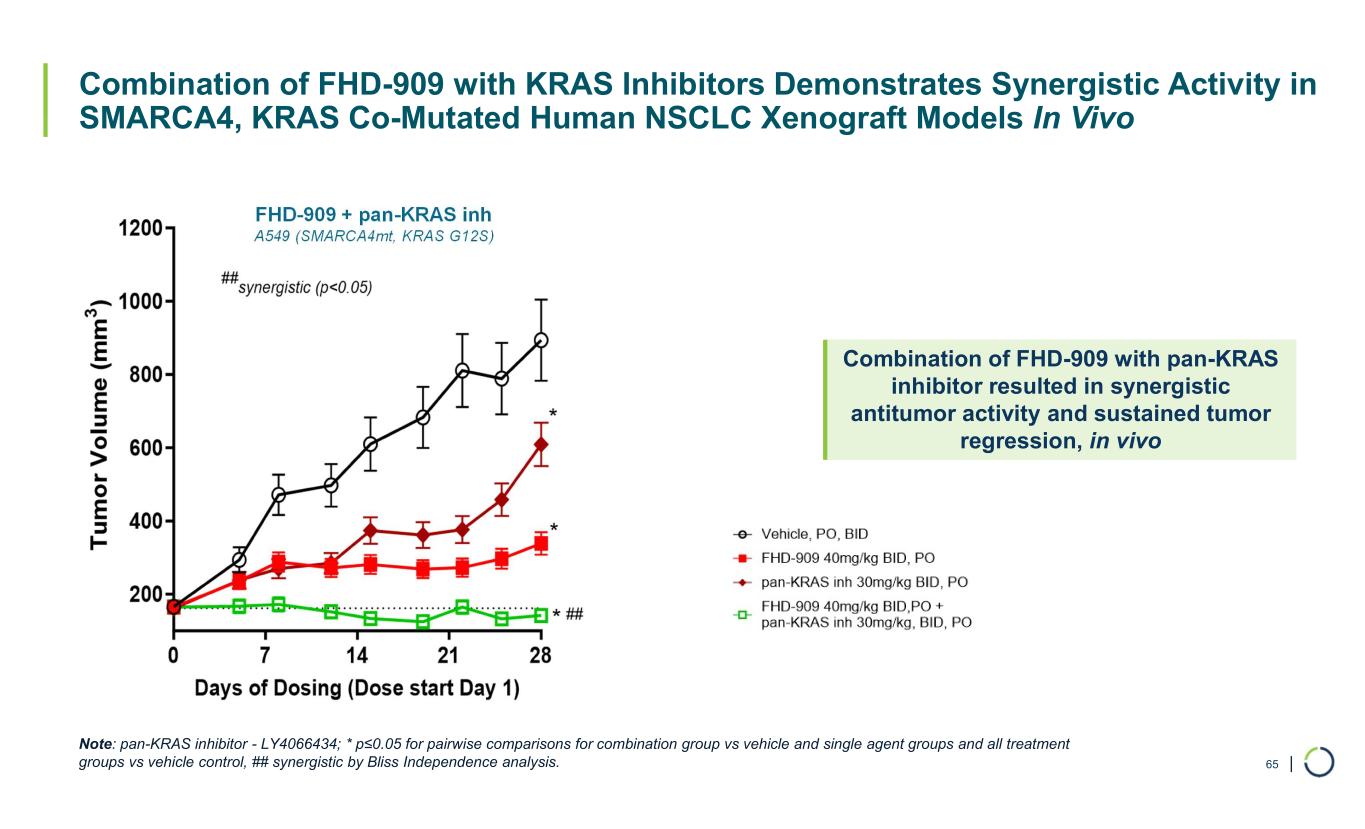 | Combination of FHD-909 with KRAS Inhibitors Demonstrates Synergistic Activity in SMARCA4, KRAS Co-Mutated Human NSCLC Xenograft Models In Vivo FHD-909 + olomorasib (KRAS G12C inh) NCI-H2030 (SMARCA4mt, KRAS G12C) 64 0 7 14 21 28 0 500 1000 1500 2000 2500 3000 Days of Dosing (Dose Start Day1) T u m o r V o lu m e (m m 3 ) ## synergistic (p<0.05) * * * ## Combination of FHD-909 with olomorasib demonstrated synergistic antitumor activity and sustained tumor regression in vivo Note: Olomorasib – LY3537982; * p≤0.05 for pairwise comparisons for combination group vs vehicle and single agent groups and all treatment groups vs vehicle control, ## synergistic by Bliss Independence analysis.