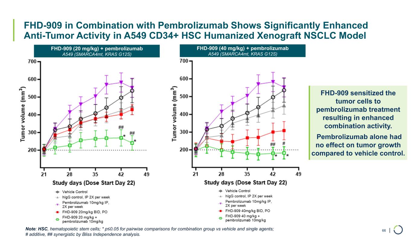 | FHD-909 in Combination with Pembrolizumab Shows Significantly Enhanced Anti-Tumor Activity in A549 CD34+ HSC Humanized Xenograft NSCLC Model 66 FHD-909 sensitized the tumor cells to pembrolizumab treatment resulting in enhanced combination activity. Pembrolizumab alone had no effect on tumor growth compared to vehicle control. Note: HSC, hematopoietic stem cells; * p≤0.05 for pairwise comparisons for combination group vs vehicle and single agents; # additive, ## synergistic by Bliss Independence analysis. FHD-909 (20 mg/kg) + pembrolizumab A549 (SMARCA4mt, KRAS G12S) FHD-909 (40 mg/kg) + pembrolizumab A549 (SMARCA4mt, KRAS G12S)