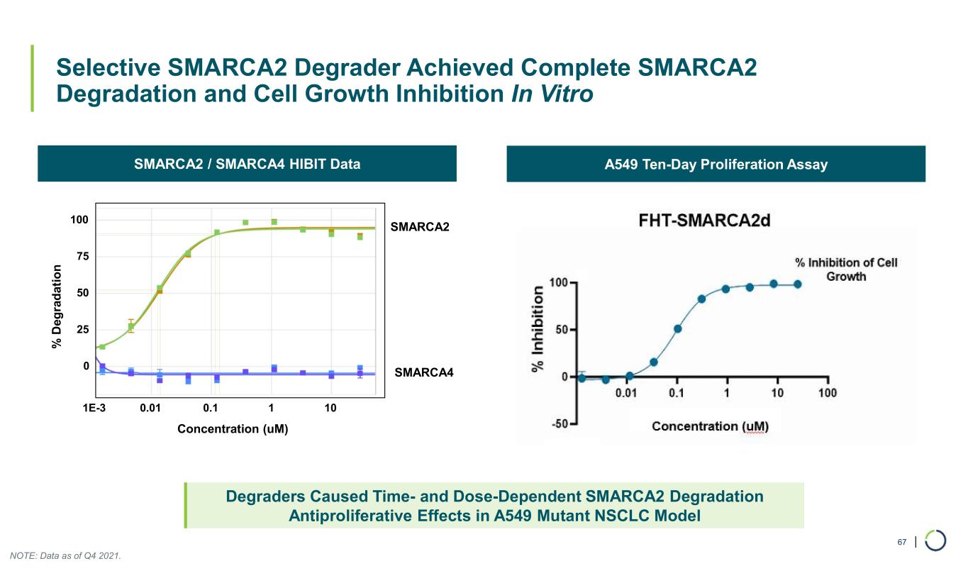 | Selective SMARCA2 Degrader Achieved Complete SMARCA2 Degradation and Cell Growth Inhibition In Vitro 67 Degraders Caused Time- and Dose-Dependent SMARCA2 Degradation Antiproliferative Effects in A549 Mutant NSCLC Model A549 Ten-Day Proliferation AssaySMARCA2 / SMARCA4 HIBIT Data SMARCA2 SMARCA4 % D eg ra d at io n Concentration (uM) 0 25 50 75 100 1E-3 0.01 0.1 1 10 NOTE: Data as of Q4 2021.