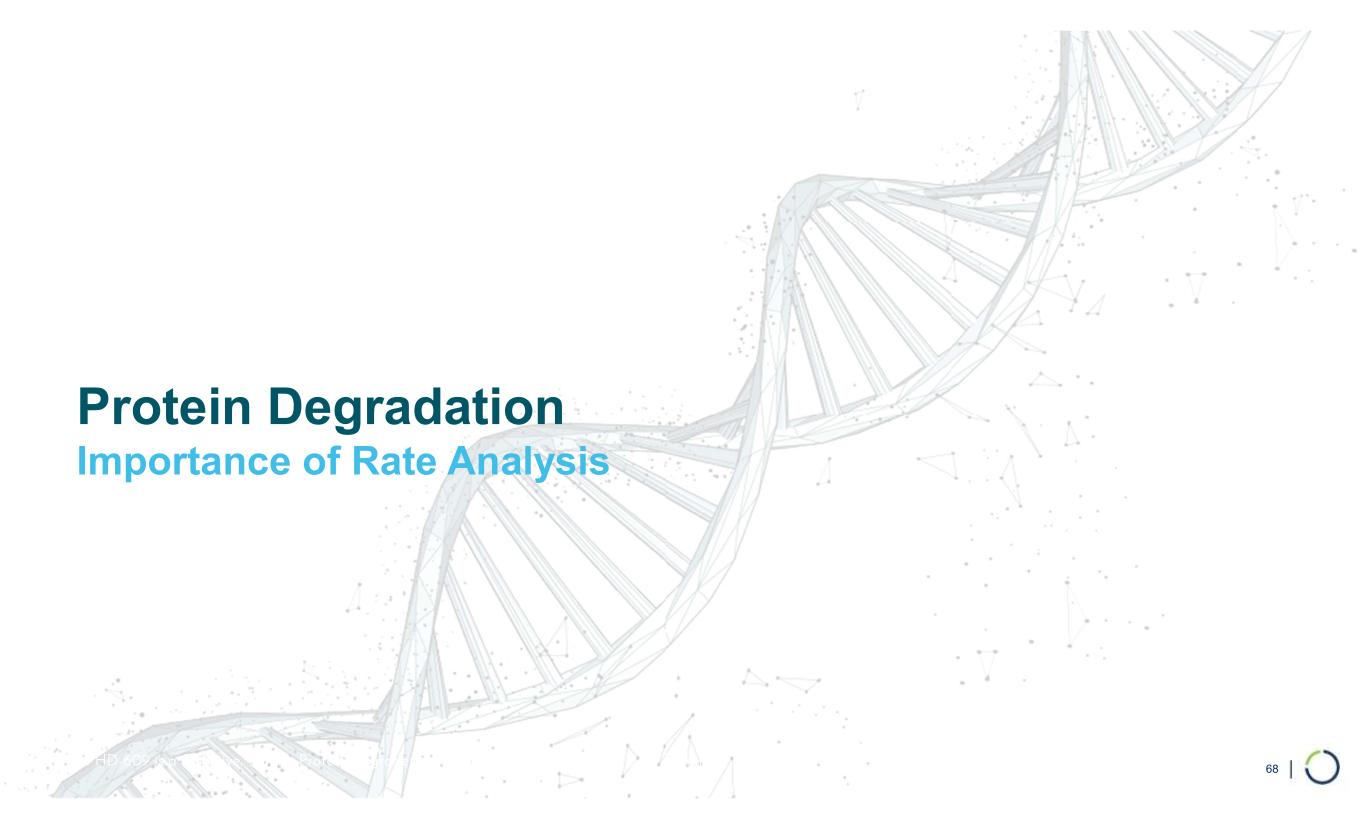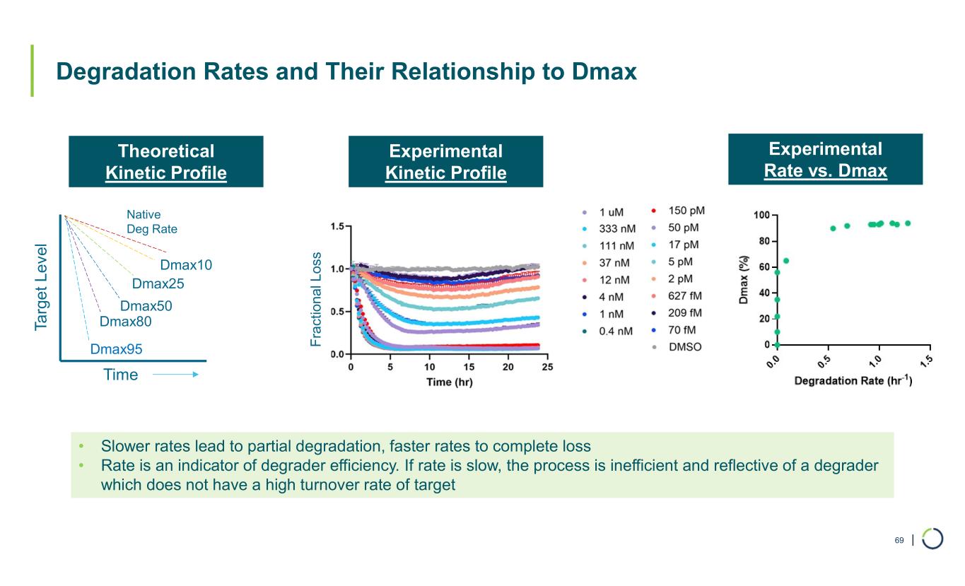 | Degradation Rates and Their Relationship to Dmax 69 • Slower rates lead to partial degradation, faster rates to complete loss • Rate is an indicator of degrader efficiency. If rate is slow, the process is inefficient and reflective of a degrader which does not have a high turnover rate of target Native Deg Rate Ta rg e t L e ve l Time Dmax10 Dmax25 Dmax50 Dmax80 Dmax95 Experimental Rate vs. Dmax Experimental Kinetic Profile Theoretical Kinetic Profile F ra ct io na l L os s