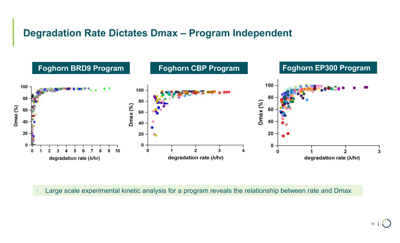 | Degradation Rate Dictates Dmax – Program Independent 70 Foghorn CBP ProgramFoghorn BRD9 Program Foghorn EP300 Program • Large scale experimental kinetic analysis for a program reveals the relationship between rate and Dmax