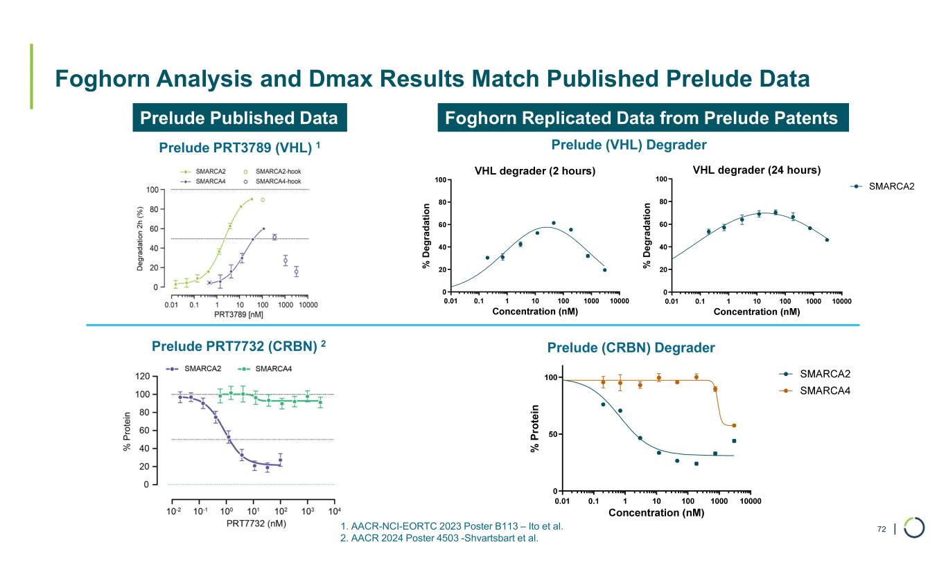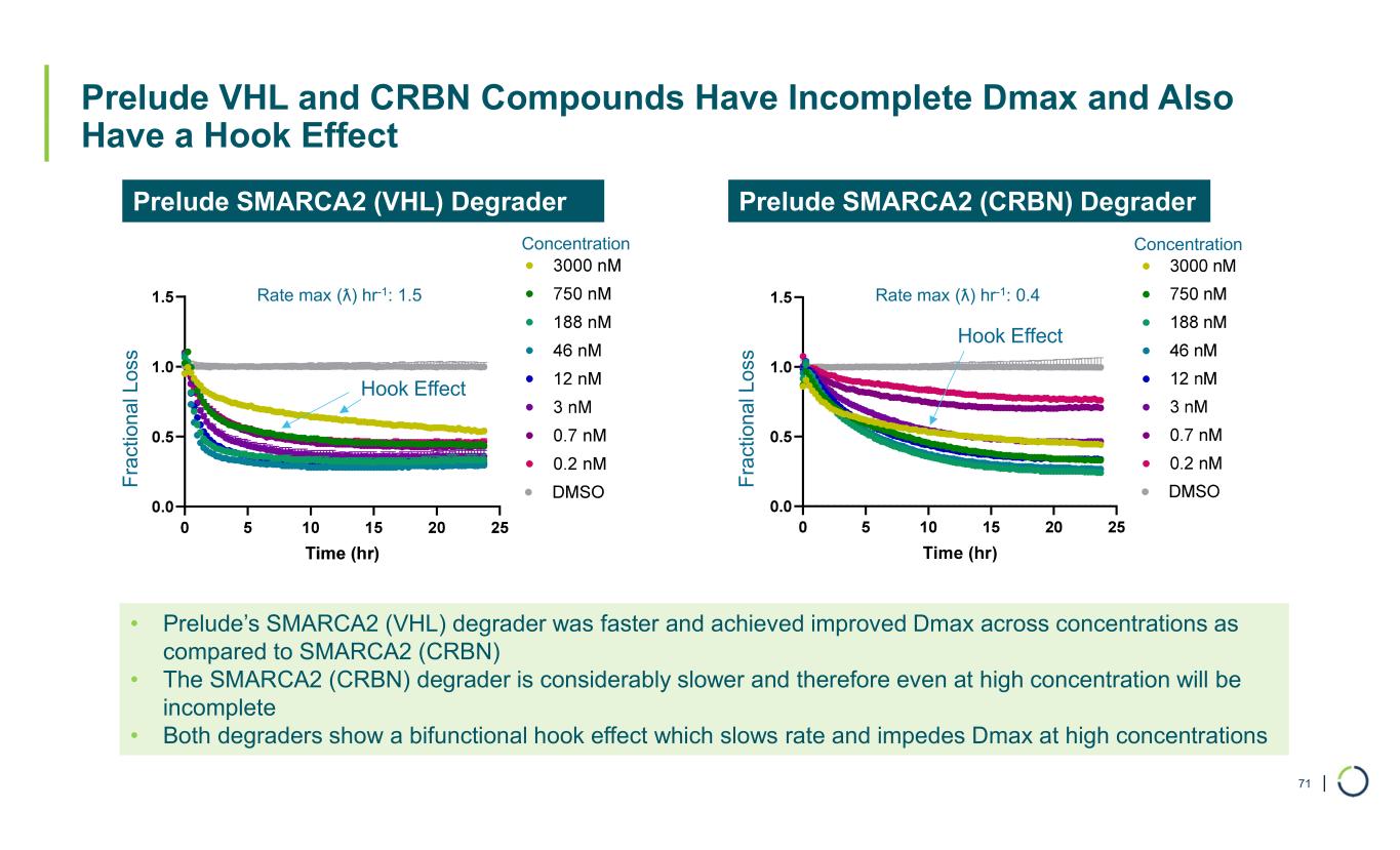 | Prelude VHL and CRBN Compounds Have Incomplete Dmax and Also Have a Hook Effect 71 • Prelude’s SMARCA2 (VHL) degrader was faster and achieved improved Dmax across concentrations as compared to SMARCA2 (CRBN) • The SMARCA2 (CRBN) degrader is considerably slower and therefore even at high concentration will be incomplete • Both degraders show a bifunctional hook effect which slows rate and impedes Dmax at high concentrations Prelude SMARCA2 (CRBN) DegraderPrelude SMARCA2 (VHL) Degrader F ra c ti o n a l L u m in e s ce n c e (R L U ) Concentration F ra ct io n a l L u m in es ce n ce (R L U ) Concentration Hook Effect Hook Effect Rate max (ƛ) hr-1: 0.4Rate max (ƛ) hr-1: 1.5 F ra ct io na l L os s F ra ct io na l L os s