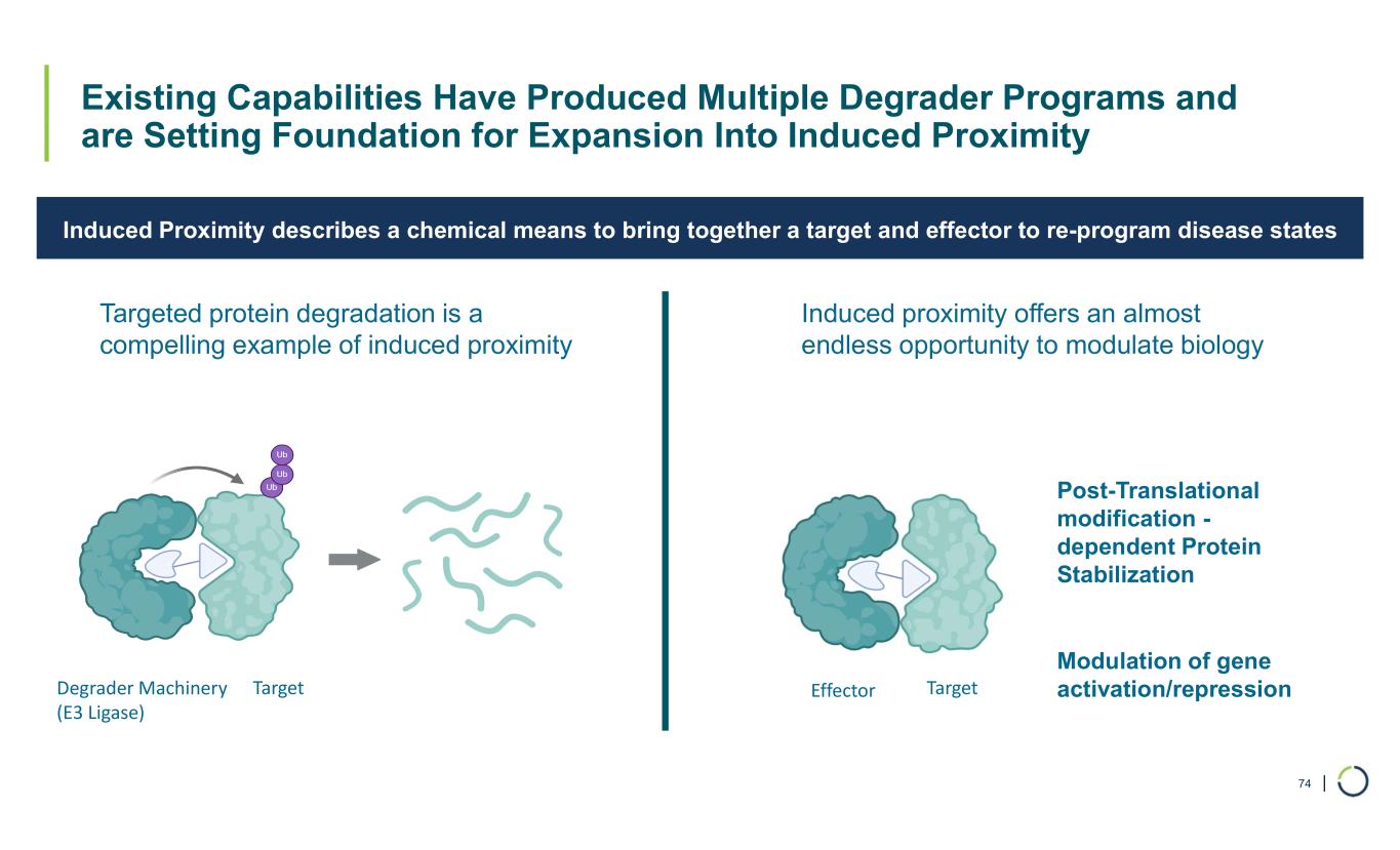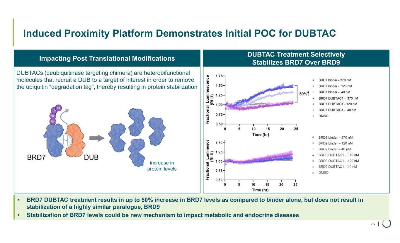 | Existing Capabilities Have Produced Multiple Degrader Programs and are Setting Foundation for Expansion Into Induced Proximity 74 TargetDegrader Machinery (E3 Ligase) TargetEffector Post-Translational modification - dependent Protein Stabilization Modulation of gene activation/repression Induced Proximity describes a chemical means to bring together a target and effector to re-program disease states Targeted protein degradation is a compelling example of induced proximity Induced proximity offers an almost endless opportunity to modulate biology