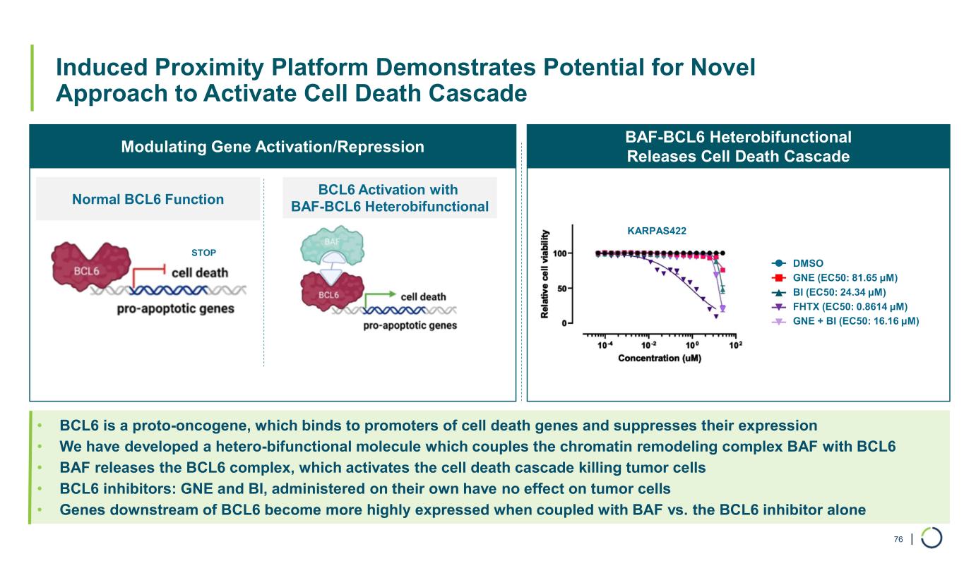 | Induced Proximity Platform Demonstrates Potential for Novel Approach to Activate Cell Death Cascade 76 Normal BCL6 Function BCL6 Activation with BAF-BCL6 Heterobifunctional • BCL6 is a proto-oncogene, which binds to promoters of cell death genes and suppresses their expression • We have developed a hetero-bifunctional molecule which couples the chromatin remodeling complex BAF with BCL6 • BAF releases the BCL6 complex, which activates the cell death cascade killing tumor cells • BCL6 inhibitors: GNE and BI, administered on their own have no effect on tumor cells • Genes downstream of BCL6 become more highly expressed when coupled with BAF vs. the BCL6 inhibitor alone STOP DMSO GNE (EC50: 81.65 μM) BI (EC50: 24.34 μM) FHTX (EC50: 0.8614 μM) GNE + BI (EC50: 16.16 μM) KARPAS422 Modulating Gene Activation/Repression BAF-BCL6 Heterobifunctional Releases Cell Death Cascade