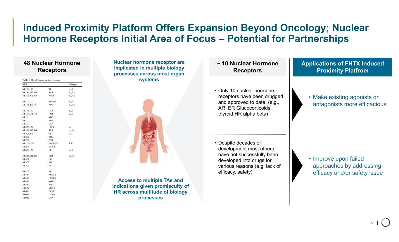 | 48 Nuclear Hormone Receptors Nuclear hormone receptor are implicated in multiple biology processes across most organ systems • Only 10 nuclear hormone receptors have been drugged and approved to date (e.g., AR, ER Glucocorticoids, thyroid HR alpha beta) • Despite decades of development most others have not successfully been developed into drugs for various reasons (e.g. lack of efficacy, safety) • Make existing agonists or antagonists more efficacious • Improve upon failed approaches by addressing efficacy and/or safety issue ~ 10 Nuclear Hormone Receptors Applications of FHTX Induced Proximity Platfrom Access to multiple TAs and indications given promiscuity of HR across multitude of biology processes Induced Proximity Platform Offers Expansion Beyond Oncology; Nuclear Hormone Receptors Initial Area of Focus – Potential for Partnerships 77