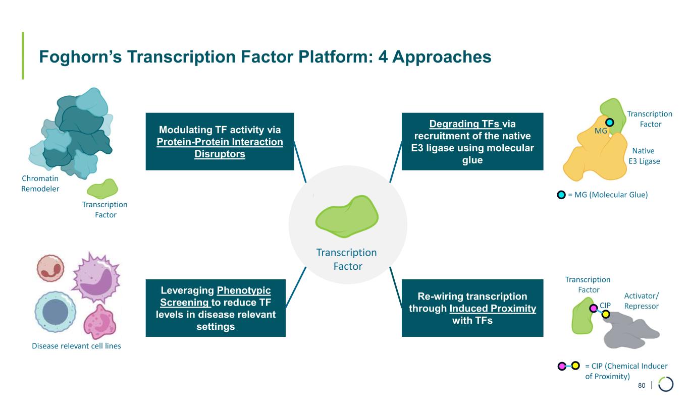 | Foghorn’s Transcription Factor Platform: 4 Approaches 80 Transcription Factor Chromatin Remodeler Modulating TF activity via Protein-Protein Interaction Disruptors Transcription Factor Native E3 Ligase Degrading TFs via recruitment of the native E3 ligase using molecular glue = MG (Molecular Glue) Leveraging Phenotypic Screening to reduce TF levels in disease relevant settings Re-wiring transcription through Induced Proximity with TFs Disease relevant cell lines Transcription Factor Activator/ Repressor = CIP (Chemical Inducer of Proximity) CIP MG Transcription Factor