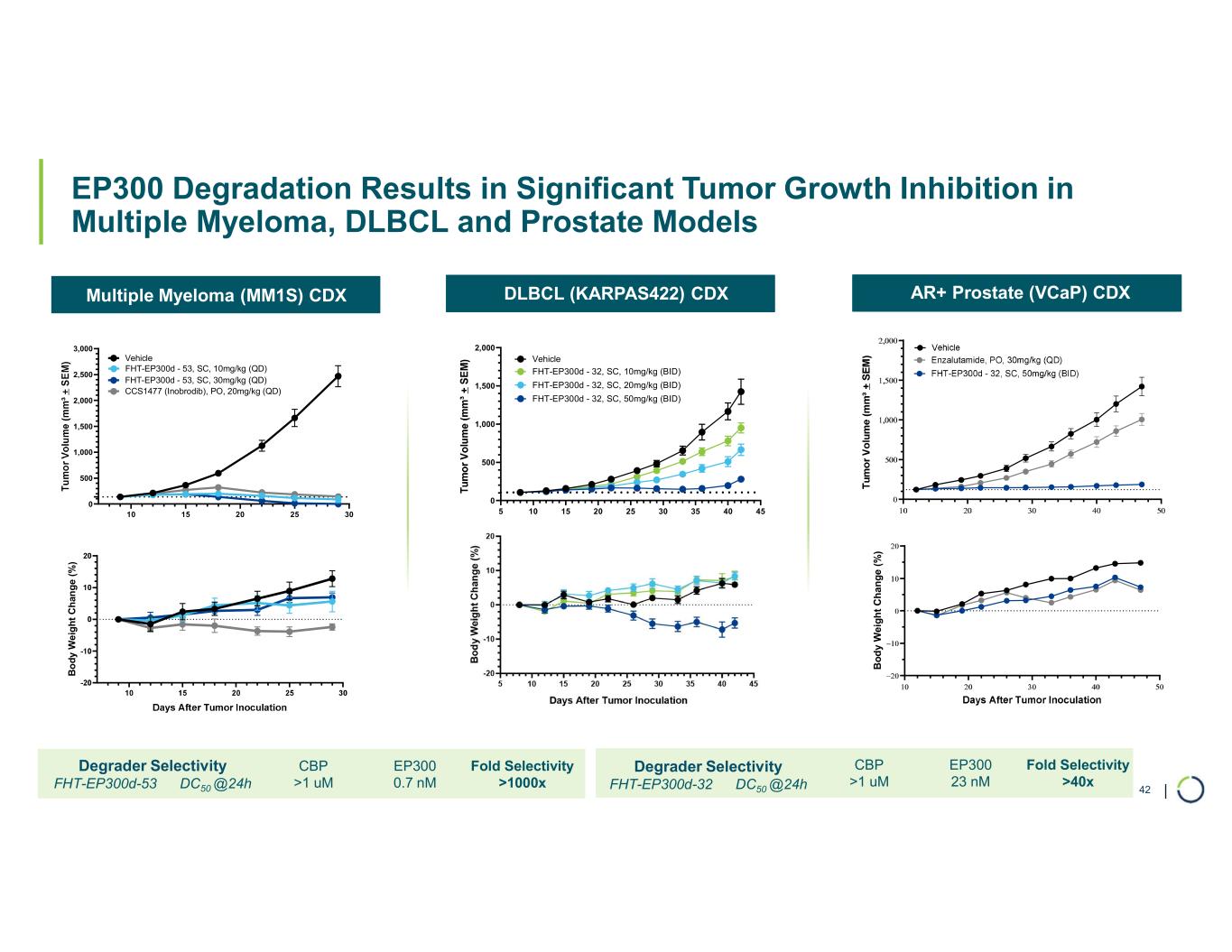 | Multiple Myeloma (MM1S) CDX DLBCL (KARPAS422) CDX AR+ Prostate (VCaP) CDX EP300 Degradation Results in Significant Tumor Growth Inhibition in Multiple Myeloma, DLBCL and Prostate Models 42 B o d y W ei g h t C h an g e ( % ) 5 10 15 20 25 30 35 40 45 0 500 1,000 1,500 2,000 Vehicle FHT-EP300d - 32, SC, 50mg/kg (BID) Days After Tumor Inoculation FHT-EP300d - 32, SC, 20mg/kg (BID) FHT-EP300d - 32, SC, 10mg/kg (BID) B o d y W e ig h t C h an g e ( % ) 10 15 20 25 30 0 500 1,000 1,500 2,000 2,500 3,000 Days After Tumor Inoculation Vehicle FHT-EP300d - 53, SC, 30mg/kg (QD) FHT-EP300d - 53, SC, 10mg/kg (QD) CCS1477 (Inobrodib), PO, 20mg/kg (QD) Fold Selectivity >1000x EP300 0.7 nM CBP >1 uM Degrader Selectivity FHT-EP300d-53 DC50 @24h Fold Selectivity >40x EP300 23 nM CBP >1 uM Degrader Selectivity FHT-EP300d-32 DC50 @24h
