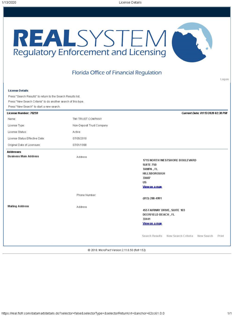 The name of the corporation shall be TMI Trust Company and its initial place of business shall be at 1715 North Westshore Boulevard, Suite 750, in the City of Tampa, in the County of Hillsborough and State of Florida. These Articles shall be effective upon filing with the Florida Division of Corporations.