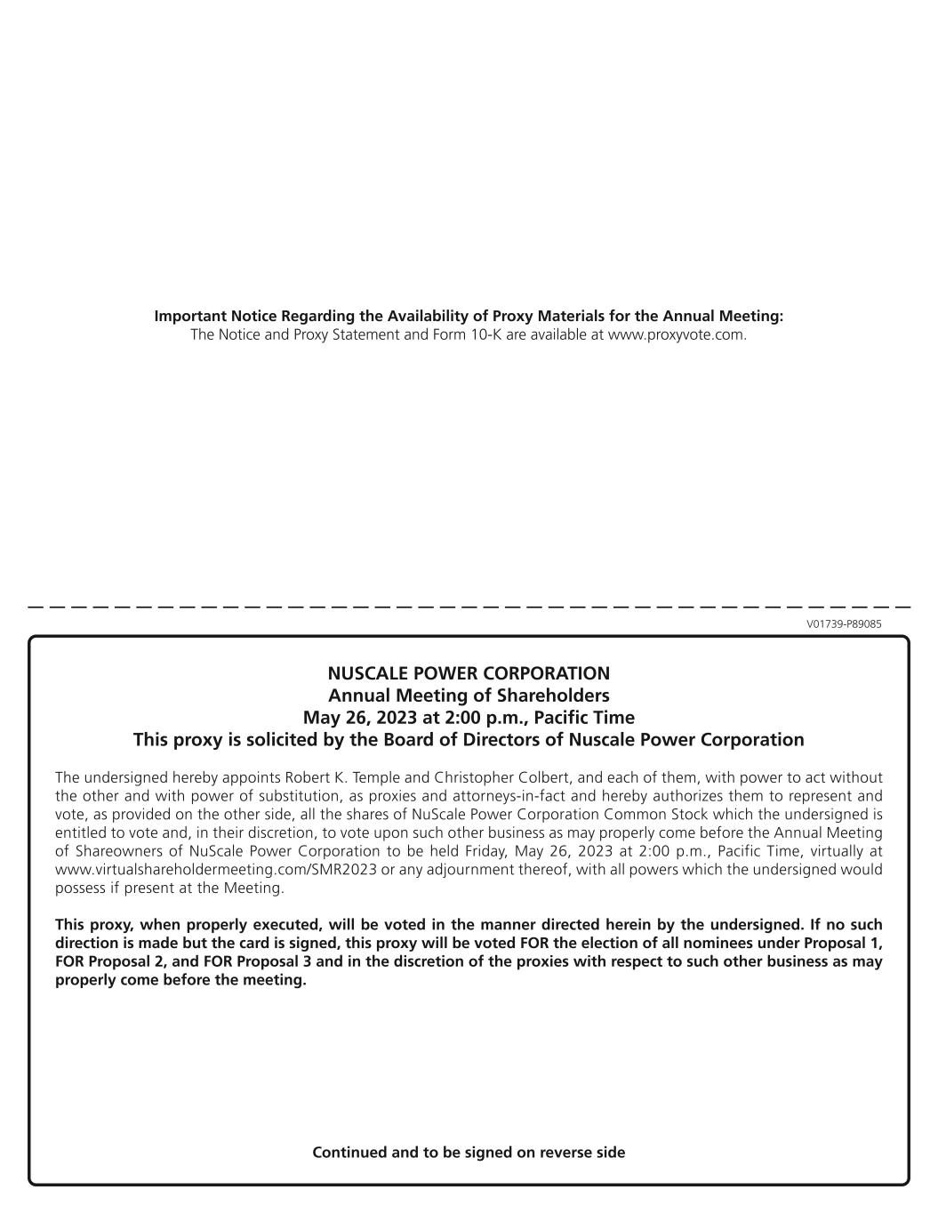 V01739-P89085 Important Notice Regarding the Availability of Proxy Materials for the Annual Meeting: The Notice and Proxy Statement and Form 10-K are available at www.proxyvote.com. NUSCALE POWER CORPORATION Annual Meeting of Shareholders May 26, 2023 at 2:00 p.m., Pacific Time This proxy is solicited by the Board of Directors of Nuscale Power Corporation The undersigned hereby appoints Robert K. Temple and Christopher Colbert, and each of them, with power to act without the other and with power of substitution, as proxies and attorneys-in-fact and hereby authorizes them to represent and vote, as provided on the other side, all the shares of NuScale Power Corporation Common Stock which the undersigned is entitled to vote and, in their discretion, to vote upon such other business as may properly come before the Annual Meeting of Shareowners of NuScale Power Corporation to be held Friday, May 26, 2023 at 2:00 p.m., Pacific Time, virtually at www.virtualshareholdermeeting.com/SMR2023 or any adjournment thereof, with all powers which the undersigned would possess if present at the Meeting. This proxy, when properly executed, will be voted in the manner directed herein by the undersigned. If no such direction is made but the card is signed, this proxy will be voted FOR the election of all nominees under Proposal 1, FOR Proposal 2, and FOR Proposal 3 and in the discretion of the proxies with respect to such other business as may properly come before the meeting. Continued and to be signed on reverse side