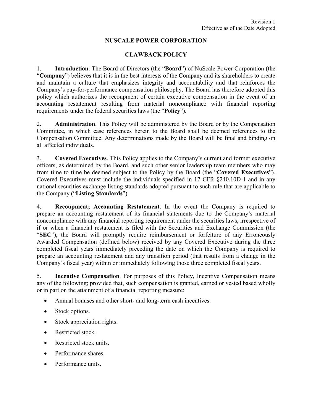 Revision 1 Effective as of the Date Adopted NUSCALE POWER CORPORATION CLAWBACK POLICY 1. Introduction. The Board of Directors (the “Board”) of NuScale Power Corporation (the “Company”) believes that it is in the best interests of the Company and its shareholders to create and maintain a culture that emphasizes integrity and accountability and that reinforces the Company’s pay-for-performance compensation philosophy. The Board has therefore adopted this policy which authorizes the recoupment of certain executive compensation in the event of an accounting restatement resulting from material noncompliance with financial reporting requirements under the federal securities laws (the “Policy”). 2. Administration. This Policy will be administered by the Board or by the Compensation Committee, in which case references herein to the Board shall be deemed references to the Compensation Committee. Any determinations made by the Board will be final and binding on all affected individuals. 3. Covered Executives. This Policy applies to the Company’s current and former executive officers, as determined by the Board, and such other senior leadership team members who may from time to time be deemed subject to the Policy by the Board (the “Covered Executives”). Covered Executives must include the individuals specified in 17 CFR §240.10D-1 and in any national securities exchange listing standards adopted pursuant to such rule that are applicable to the Company (“Listing Standards”). 4. Recoupment; Accounting Restatement. In the event the Company is required to prepare an accounting restatement of its financial statements due to the Company’s material noncompliance with any financial reporting requirement under the securities laws, irrespective of if or when a financial restatement is filed with the Securities and Exchange Commission (the “SEC”), the Board will promptly require reimbursement or forfeiture of any Erroneously Awarded Compensation (defined below) received by any Covered Executive during the three completed fiscal years immediately preceding the date on which the Company is required to prepare an accounting restatement and any transition period (that results from a change in the Company’s fiscal year) within or immediately following those three completed fiscal years. 5. Incentive Compensation. For purposes of this Policy, Incentive Compensation means any of the following; provided that, such compensation is granted, earned or vested based wholly or in part on the attainment of a financial reporting measure: • Annual bonuses and other short- and long-term cash incentives. • Stock options. • Stock appreciation rights. • Restricted stock. • Restricted stock units. • Performance shares. • Performance units.