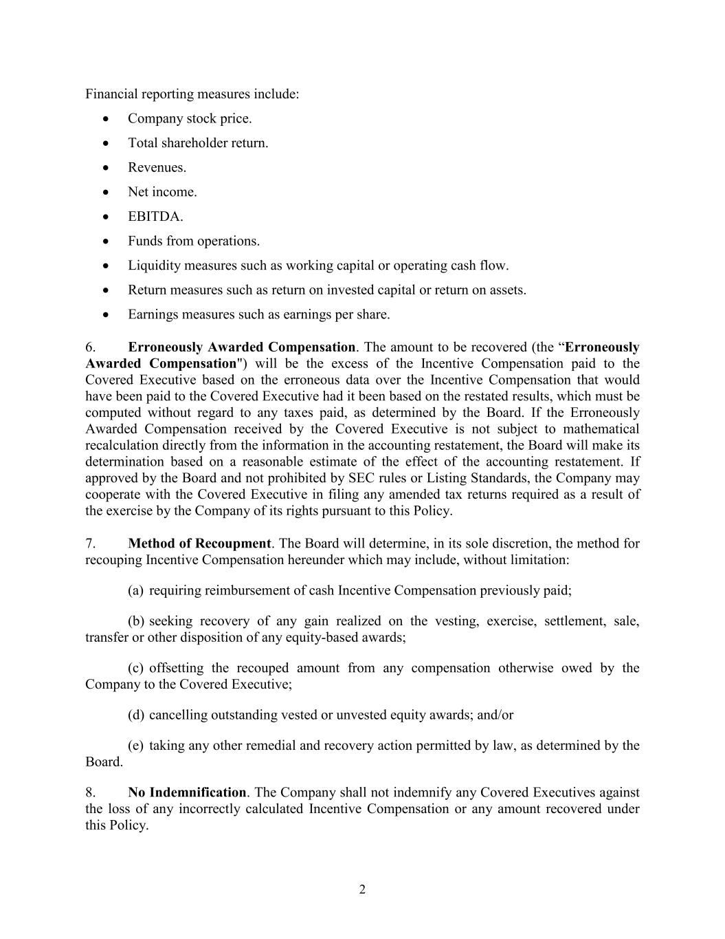 2 Financial reporting measures include: • Company stock price. • Total shareholder return. • Revenues. • Net income. • EBITDA. • Funds from operations. • Liquidity measures such as working capital or operating cash flow. • Return measures such as return on invested capital or return on assets. • Earnings measures such as earnings per share. 6. Erroneously Awarded Compensation. The amount to be recovered (the “Erroneously Awarded Compensation") will be the excess of the Incentive Compensation paid to the Covered Executive based on the erroneous data over the Incentive Compensation that would have been paid to the Covered Executive had it been based on the restated results, which must be computed without regard to any taxes paid, as determined by the Board. If the Erroneously Awarded Compensation received by the Covered Executive is not subject to mathematical recalculation directly from the information in the accounting restatement, the Board will make its determination based on a reasonable estimate of the effect of the accounting restatement. If approved by the Board and not prohibited by SEC rules or Listing Standards, the Company may cooperate with the Covered Executive in filing any amended tax returns required as a result of the exercise by the Company of its rights pursuant to this Policy. 7. Method of Recoupment. The Board will determine, in its sole discretion, the method for recouping Incentive Compensation hereunder which may include, without limitation: (a) requiring reimbursement of cash Incentive Compensation previously paid; (b) seeking recovery of any gain realized on the vesting, exercise, settlement, sale, transfer or other disposition of any equity-based awards; (c) offsetting the recouped amount from any compensation otherwise owed by the Company to the Covered Executive; (d) cancelling outstanding vested or unvested equity awards; and/or (e) taking any other remedial and recovery action permitted by law, as determined by the Board. 8. No Indemnification. The Company shall not indemnify any Covered Executives against the loss of any incorrectly calculated Incentive Compensation or any amount recovered under this Policy.
