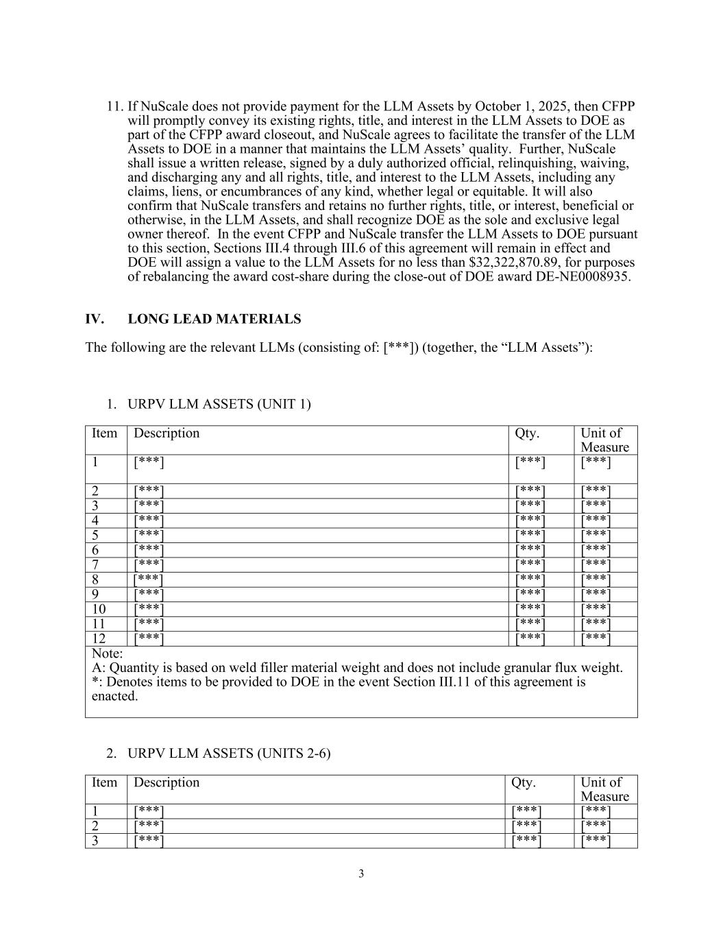 3 11. If NuScale does not provide payment for the LLM Assets by October 1, 2025, then CFPP will promptly convey its existing rights, title, and interest in the LLM Assets to DOE as part of the CFPP award closeout, and NuScale agrees to facilitate the transfer of the LLM Assets to DOE in a manner that maintains the LLM Assets’ quality. Further, NuScale shall issue a written release, signed by a duly authorized official, relinquishing, waiving, and discharging any and all rights, title, and interest to the LLM Assets, including any claims, liens, or encumbrances of any kind, whether legal or equitable. It will also confirm that NuScale transfers and retains no further rights, title, or interest, beneficial or otherwise, in the LLM Assets, and shall recognize DOE as the sole and exclusive legal owner thereof. In the event CFPP and NuScale transfer the LLM Assets to DOE pursuant to this section, Sections III.4 through III.6 of this agreement will remain in effect and DOE will assign a value to the LLM Assets for no less than $32,322,870.89, for purposes of rebalancing the award cost-share during the close-out of DOE award DE-NE0008935. IV. LONG LEAD MATERIALS The following are the relevant LLMs (consisting of: [***]) (together, the “LLM Assets”): 1. URPV LLM ASSETS (UNIT 1) Item Description Qty. Unit of Measure 1 [***] [***] [***] 2 [***] [***] [***] 3 [***] [***] [***] 4 [***] [***] [***] 5 [***] [***] [***] 6 [***] [***] [***] 7 [***] [***] [***] 8 [***] [***] [***] 9 [***] [***] [***] 10 [***] [***] [***] 11 [***] [***] [***] 12 [***] [***] [***] Note: A: Quantity is based on weld filler material weight and does not include granular flux weight. *: Denotes items to be provided to DOE in the event Section III.11 of this agreement is enacted. 2. URPV LLM ASSETS (UNITS 2-6) Item Description Qty. Unit of Measure 1 [***] [***] [***] 2 [***] [***] [***] 3 [***] [***] [***]