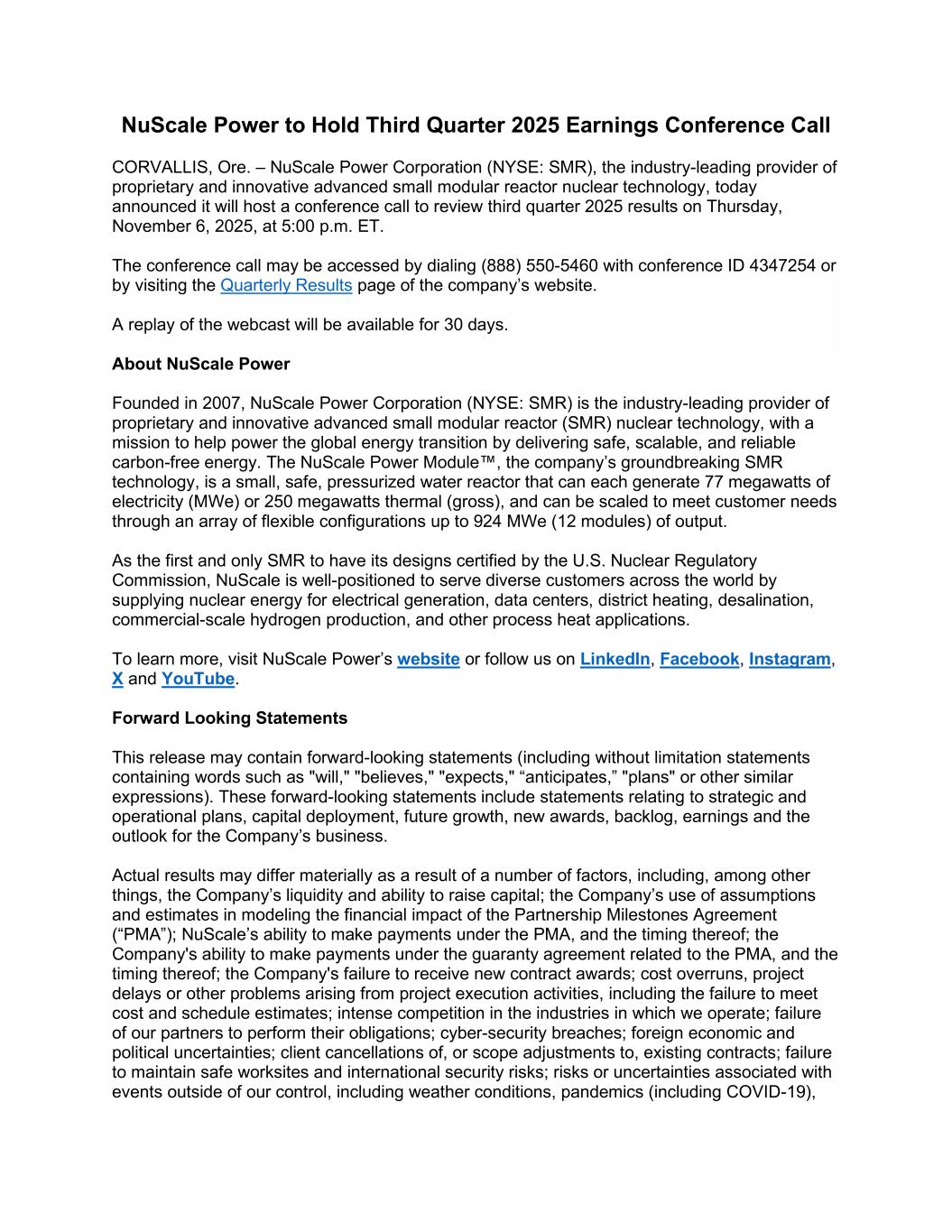 NuScale Power to Hold Third Quarter 2025 Earnings Conference Call CORVALLIS, Ore. – NuScale Power Corporation (NYSE: SMR), the industry-leading provider of proprietary and innovative advanced small modular reactor nuclear technology, today announced it will host a conference call to review third quarter 2025 results on Thursday, November 6, 2025, at 5:00 p.m. ET. The conference call may be accessed by dialing (888) 550-5460 with conference ID 4347254 or by visiting the Quarterly Results page of the company’s website. A replay of the webcast will be available for 30 days. About NuScale Power Founded in 2007, NuScale Power Corporation (NYSE: SMR) is the industry-leading provider of proprietary and innovative advanced small modular reactor (SMR) nuclear technology, with a mission to help power the global energy transition by delivering safe, scalable, and reliable carbon-free energy. The NuScale Power Module™, the company’s groundbreaking SMR technology, is a small, safe, pressurized water reactor that can each generate 77 megawatts of electricity (MWe) or 250 megawatts thermal (gross), and can be scaled to meet customer needs through an array of flexible configurations up to 924 MWe (12 modules) of output. As the first and only SMR to have its designs certified by the U.S. Nuclear Regulatory Commission, NuScale is well-positioned to serve diverse customers across the world by supplying nuclear energy for electrical generation, data centers, district heating, desalination, commercial-scale hydrogen production, and other process heat applications. To learn more, visit NuScale Power’s website or follow us on LinkedIn, Facebook, Instagram, X and YouTube. Forward Looking Statements This release may contain forward-looking statements (including without limitation statements containing words such as "will," "believes," "expects," “anticipates,” "plans" or other similar expressions). These forward-looking statements include statements relating to strategic and operational plans, capital deployment, future growth, new awards, backlog, earnings and the outlook for the Company’s business. Actual results may differ materially as a result of a number of factors, including, among other things, the Company’s liquidity and ability to raise capital; the Company’s use of assumptions and estimates in modeling the financial impact of the Partnership Milestones Agreement (“PMA”); NuScale’s ability to make payments under the PMA, and the timing thereof; the Company's ability to make payments under the guaranty agreement related to the PMA, and the timing thereof; the Company's failure to receive new contract awards; cost overruns, project delays or other problems arising from project execution activities, including the failure to meet cost and schedule estimates; intense competition in the industries in which we operate; failure of our partners to perform their obligations; cyber-security breaches; foreign economic and political uncertainties; client cancellations of, or scope adjustments to, existing contracts; failure to maintain safe worksites and international security risks; risks or uncertainties associated with events outside of our control, including weather conditions, pandemics (including COVID-19),