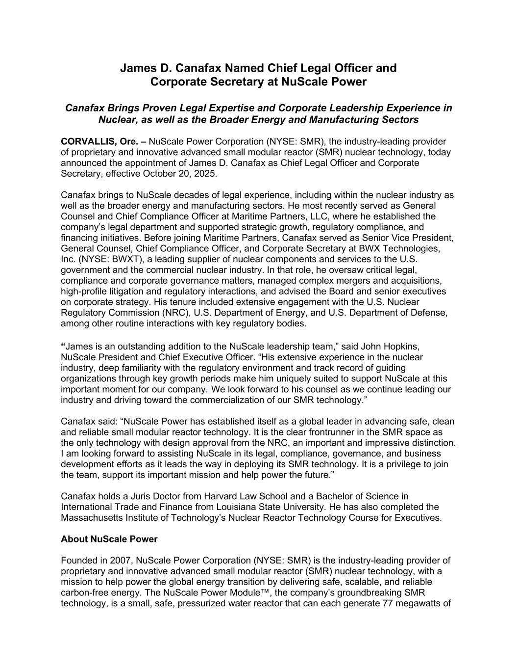 James D. Canafax Named Chief Legal Officer and Corporate Secretary at NuScale Power Canafax Brings Proven Legal Expertise and Corporate Leadership Experience in Nuclear, as well as the Broader Energy and Manufacturing Sectors CORVALLIS, Ore. – NuScale Power Corporation (NYSE: SMR), the industry-leading provider of proprietary and innovative advanced small modular reactor (SMR) nuclear technology, today announced the appointment of James D. Canafax as Chief Legal Officer and Corporate Secretary, effective October 20, 2025. Canafax brings to NuScale decades of legal experience, including within the nuclear industry as well as the broader energy and manufacturing sectors. He most recently served as General Counsel and Chief Compliance Officer at Maritime Partners, LLC, where he established the company’s legal department and supported strategic growth, regulatory compliance, and financing initiatives. Before joining Maritime Partners, Canafax served as Senior Vice President, General Counsel, Chief Compliance Officer, and Corporate Secretary at BWX Technologies, Inc. (NYSE: BWXT), a leading supplier of nuclear components and services to the U.S. government and the commercial nuclear industry. In that role, he oversaw critical legal, compliance and corporate governance matters, managed complex mergers and acquisitions, high-profile litigation and regulatory interactions, and advised the Board and senior executives on corporate strategy. His tenure included extensive engagement with the U.S. Nuclear Regulatory Commission (NRC), U.S. Department of Energy, and U.S. Department of Defense, among other routine interactions with key regulatory bodies. “James is an outstanding addition to the NuScale leadership team,” said John Hopkins, NuScale President and Chief Executive Officer. “His extensive experience in the nuclear industry, deep familiarity with the regulatory environment and track record of guiding organizations through key growth periods make him uniquely suited to support NuScale at this important moment for our company. We look forward to his counsel as we continue leading our industry and driving toward the commercialization of our SMR technology.” Canafax said: “NuScale Power has established itself as a global leader in advancing safe, clean and reliable small modular reactor technology. It is the clear frontrunner in the SMR space as the only technology with design approval from the NRC, an important and impressive distinction. I am looking forward to assisting NuScale in its legal, compliance, governance, and business development efforts as it leads the way in deploying its SMR technology. It is a privilege to join the team, support its important mission and help power the future.” Canafax holds a Juris Doctor from Harvard Law School and a Bachelor of Science in International Trade and Finance from Louisiana State University. He has also completed the Massachusetts Institute of Technology’s Nuclear Reactor Technology Course for Executives. About NuScale Power Founded in 2007, NuScale Power Corporation (NYSE: SMR) is the industry-leading provider of proprietary and innovative advanced small modular reactor (SMR) nuclear technology, with a mission to help power the global energy transition by delivering safe, scalable, and reliable carbon-free energy. The NuScale Power Module™, the company’s groundbreaking SMR technology, is a small, safe, pressurized water reactor that can each generate 77 megawatts of