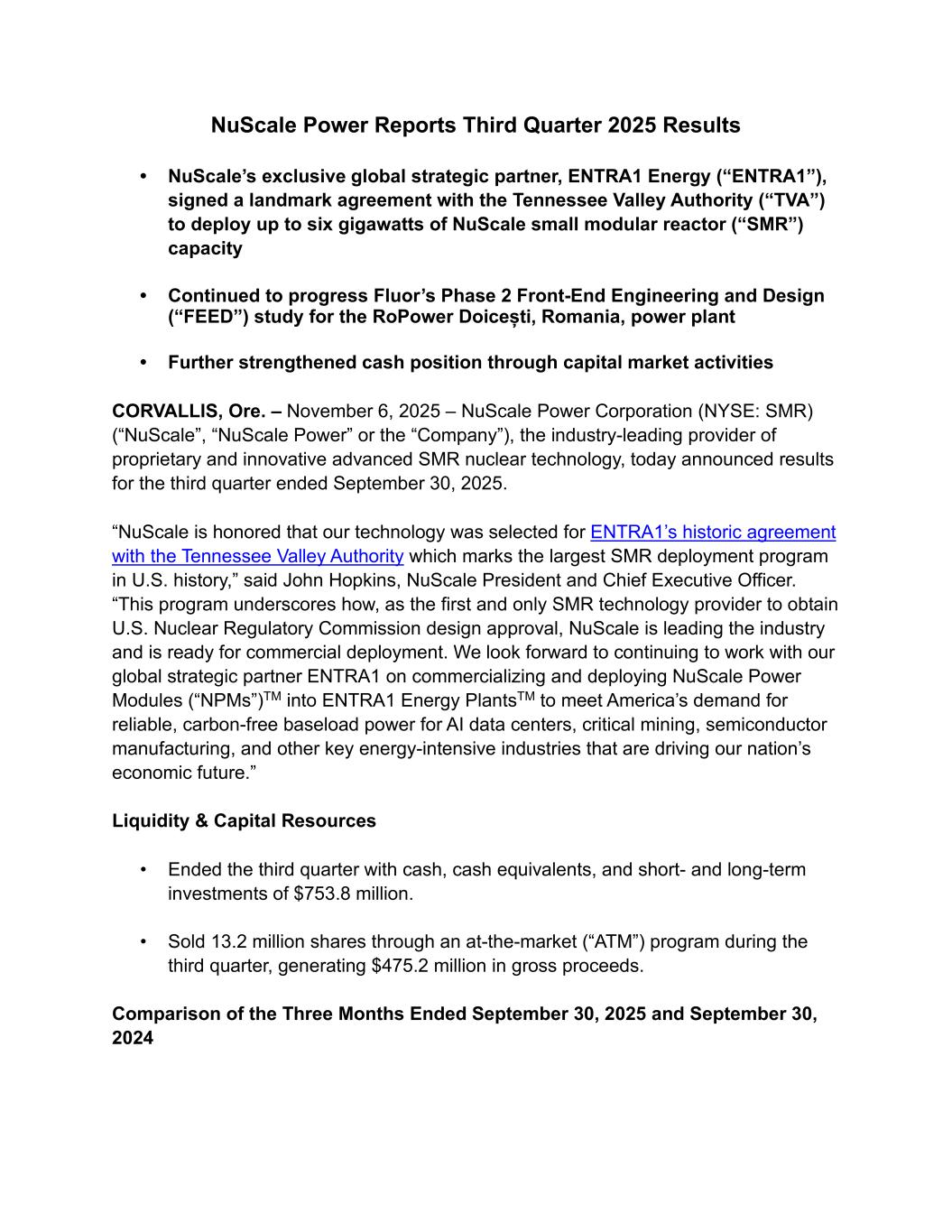 NuScale Power Reports Third Quarter 2025 Results • NuScale’s exclusive global strategic partner, ENTRA1 Energy (“ENTRA1”), signed a landmark agreement with the Tennessee Valley Authority (“TVA”) to deploy up to six gigawatts of NuScale small modular reactor (“SMR”) capacity • Continued to progress Fluor’s Phase 2 Front-End Engineering and Design (“FEED”) study for the RoPower Doicești, Romania, power plant • Further strengthened cash position through capital market activities CORVALLIS, Ore. – November 6, 2025 – NuScale Power Corporation (NYSE: SMR) (“NuScale”, “NuScale Power” or the “Company”), the industry-leading provider of proprietary and innovative advanced SMR nuclear technology, today announced results for the third quarter ended September 30, 2025. “NuScale is honored that our technology was selected for ENTRA1’s historic agreement with the Tennessee Valley Authority which marks the largest SMR deployment program in U.S. history,” said John Hopkins, NuScale President and Chief Executive Officer. “This program underscores how, as the first and only SMR technology provider to obtain U.S. Nuclear Regulatory Commission design approval, NuScale is leading the industry and is ready for commercial deployment. We look forward to continuing to work with our global strategic partner ENTRA1 on commercializing and deploying NuScale Power Modules (“NPMs”)TM into ENTRA1 Energy PlantsTM to meet America’s demand for reliable, carbon-free baseload power for AI data centers, critical mining, semiconductor manufacturing, and other key energy-intensive industries that are driving our nation’s economic future.” Liquidity & Capital Resources • Ended the third quarter with cash, cash equivalents, and short- and long-term investments of $753.8 million. • Sold 13.2 million shares through an at-the-market (“ATM”) program during the third quarter, generating $475.2 million in gross proceeds. Comparison of the Three Months Ended September 30, 2025 and September 30, 2024