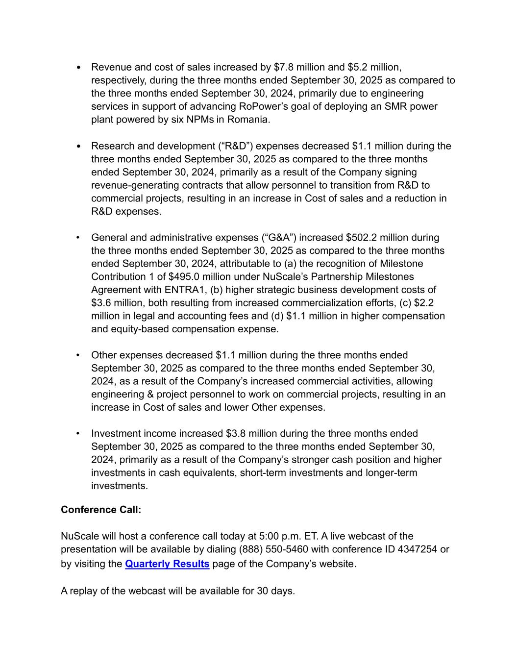 • Revenue and cost of sales increased by $7.8 million and $5.2 million, respectively, during the three months ended September 30, 2025 as compared to the three months ended September 30, 2024, primarily due to engineering services in support of advancing RoPower’s goal of deploying an SMR power plant powered by six NPMs in Romania. • Research and development (“R&D”) expenses decreased $1.1 million during the three months ended September 30, 2025 as compared to the three months ended September 30, 2024, primarily as a result of the Company signing revenue-generating contracts that allow personnel to transition from R&D to commercial projects, resulting in an increase in Cost of sales and a reduction in R&D expenses. • General and administrative expenses (“G&A”) increased $502.2 million during the three months ended September 30, 2025 as compared to the three months ended September 30, 2024, attributable to (a) the recognition of Milestone Contribution 1 of $495.0 million under NuScale’s Partnership Milestones Agreement with ENTRA1, (b) higher strategic business development costs of $3.6 million, both resulting from increased commercialization efforts, (c) $2.2 million in legal and accounting fees and (d) $1.1 million in higher compensation and equity-based compensation expense. • Other expenses decreased $1.1 million during the three months ended September 30, 2025 as compared to the three months ended September 30, 2024, as a result of the Company’s increased commercial activities, allowing engineering & project personnel to work on commercial projects, resulting in an increase in Cost of sales and lower Other expenses. • Investment income increased $3.8 million during the three months ended September 30, 2025 as compared to the three months ended September 30, 2024, primarily as a result of the Company’s stronger cash position and higher investments in cash equivalents, short-term investments and longer-term investments. Conference Call: NuScale will host a conference call today at 5:00 p.m. ET. A live webcast of the presentation will be available by dialing (888) 550-5460 with conference ID 4347254 or by visiting the Quarterly Results page of the Company’s website. A replay of the webcast will be available for 30 days.