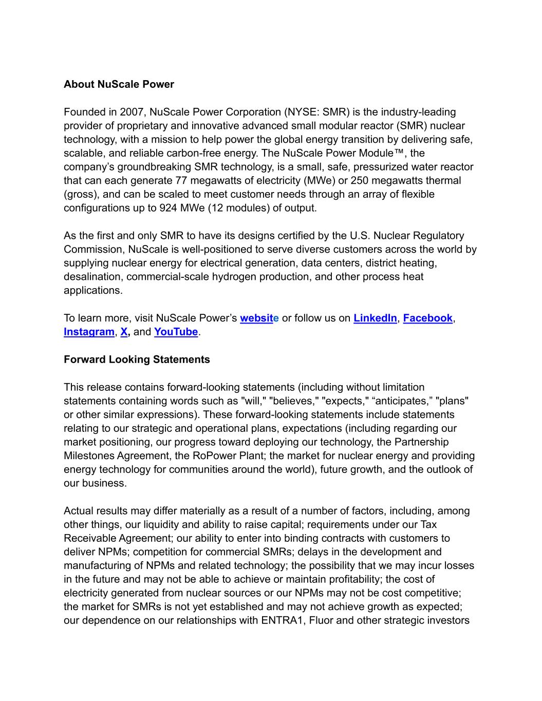 About NuScale Power Founded in 2007, NuScale Power Corporation (NYSE: SMR) is the industry-leading provider of proprietary and innovative advanced small modular reactor (SMR) nuclear technology, with a mission to help power the global energy transition by delivering safe, scalable, and reliable carbon-free energy. The NuScale Power Module™, the company’s groundbreaking SMR technology, is a small, safe, pressurized water reactor that can each generate 77 megawatts of electricity (MWe) or 250 megawatts thermal (gross), and can be scaled to meet customer needs through an array of flexible configurations up to 924 MWe (12 modules) of output. As the first and only SMR to have its designs certified by the U.S. Nuclear Regulatory Commission, NuScale is well-positioned to serve diverse customers across the world by supplying nuclear energy for electrical generation, data centers, district heating, desalination, commercial-scale hydrogen production, and other process heat applications. To learn more, visit NuScale Power’s website or follow us on LinkedIn, Facebook, Instagram, X, and YouTube. Forward Looking Statements This release contains forward-looking statements (including without limitation statements containing words such as "will," "believes," "expects," “anticipates,” "plans" or other similar expressions). These forward-looking statements include statements relating to our strategic and operational plans, expectations (including regarding our market positioning, our progress toward deploying our technology, the Partnership Milestones Agreement, the RoPower Plant; the market for nuclear energy and providing energy technology for communities around the world), future growth, and the outlook of our business. Actual results may differ materially as a result of a number of factors, including, among other things, our liquidity and ability to raise capital; requirements under our Tax Receivable Agreement; our ability to enter into binding contracts with customers to deliver NPMs; competition for commercial SMRs; delays in the development and manufacturing of NPMs and related technology; the possibility that we may incur losses in the future and may not be able to achieve or maintain profitability; the cost of electricity generated from nuclear sources or our NPMs may not be cost competitive; the market for SMRs is not yet established and may not achieve growth as expected; our dependence on our relationships with ENTRA1, Fluor and other strategic investors
