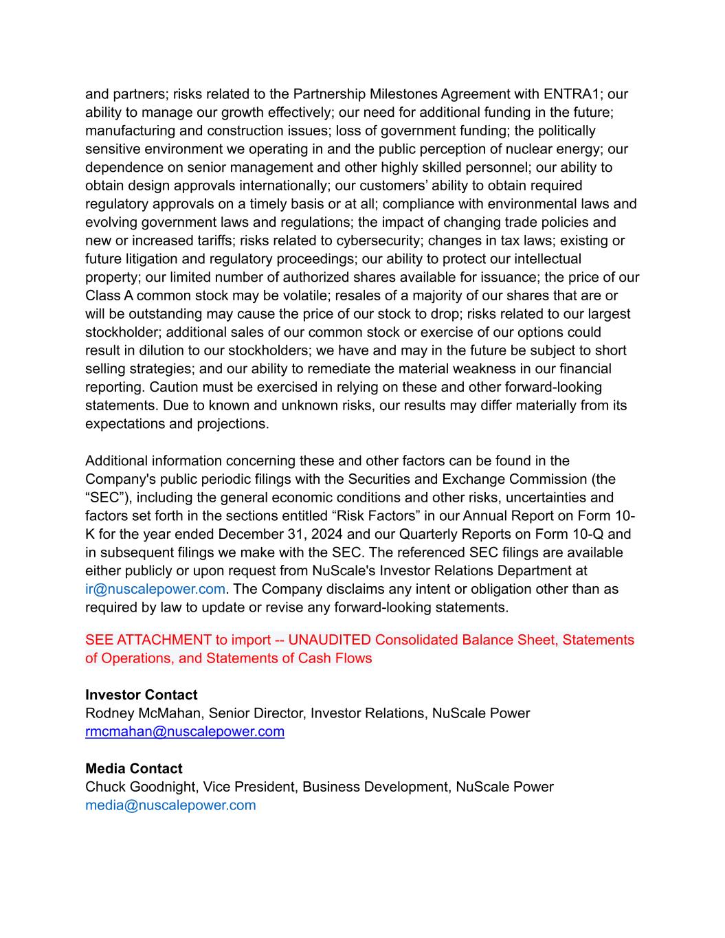 and partners; risks related to the Partnership Milestones Agreement with ENTRA1; our ability to manage our growth effectively; our need for additional funding in the future; manufacturing and construction issues; loss of government funding; the politically sensitive environment we operating in and the public perception of nuclear energy; our dependence on senior management and other highly skilled personnel; our ability to obtain design approvals internationally; our customers’ ability to obtain required regulatory approvals on a timely basis or at all; compliance with environmental laws and evolving government laws and regulations; the impact of changing trade policies and new or increased tariffs; risks related to cybersecurity; changes in tax laws; existing or future litigation and regulatory proceedings; our ability to protect our intellectual property; our limited number of authorized shares available for issuance; the price of our Class A common stock may be volatile; resales of a majority of our shares that are or will be outstanding may cause the price of our stock to drop; risks related to our largest stockholder; additional sales of our common stock or exercise of our options could result in dilution to our stockholders; we have and may in the future be subject to short selling strategies; and our ability to remediate the material weakness in our financial reporting. Caution must be exercised in relying on these and other forward-looking statements. Due to known and unknown risks, our results may differ materially from its expectations and projections. Additional information concerning these and other factors can be found in the Company's public periodic filings with the Securities and Exchange Commission (the “SEC”), including the general economic conditions and other risks, uncertainties and factors set forth in the sections entitled “Risk Factors” in our Annual Report on Form 10- K for the year ended December 31, 2024 and our Quarterly Reports on Form 10-Q and in subsequent filings we make with the SEC. The referenced SEC filings are available either publicly or upon request from NuScale's Investor Relations Department at ir@nuscalepower.com. The Company disclaims any intent or obligation other than as required by law to update or revise any forward-looking statements. SEE ATTACHMENT to import -- UNAUDITED Consolidated Balance Sheet, Statements of Operations, and Statements of Cash Flows Investor Contact Rodney McMahan, Senior Director, Investor Relations, NuScale Power rmcmahan@nuscalepower.com Media Contact Chuck Goodnight, Vice President, Business Development, NuScale Power media@nuscalepower.com