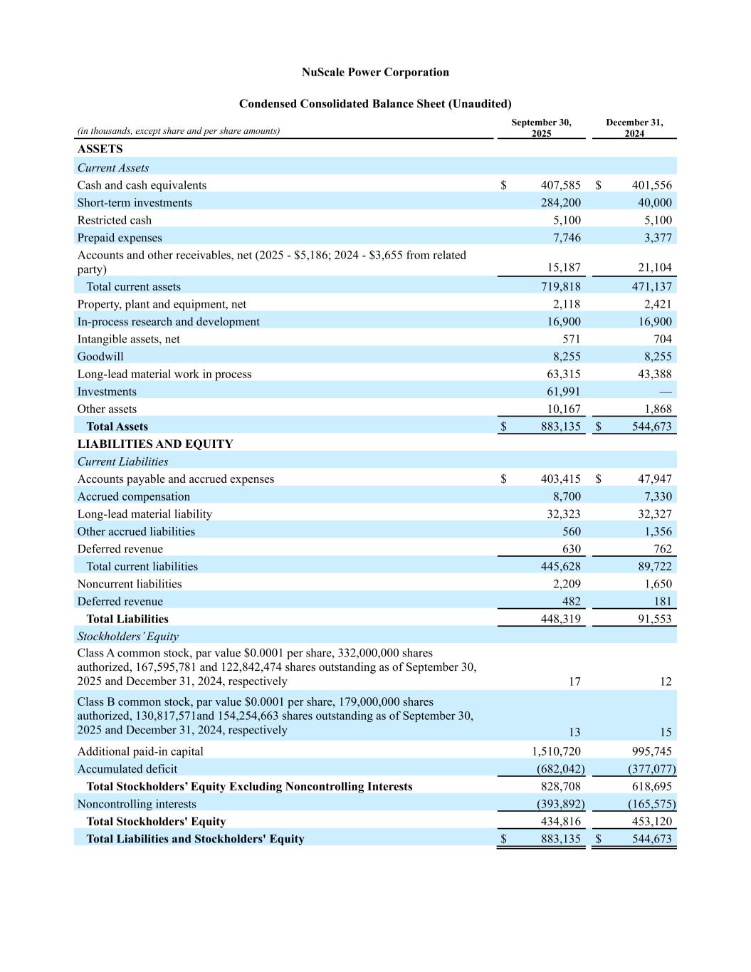 NuScale Power Corporation Condensed Consolidated Balance Sheet (Unaudited) (in thousands, except share and per share amounts) September 30, 2025 December 31, 2024 ASSETS Current Assets Cash and cash equivalents $ 407,585 $ 401,556 Short-term investments 284,200 40,000 Restricted cash 5,100 5,100 Prepaid expenses 7,746 3,377 Accounts and other receivables, net (2025 - $5,186; 2024 - $3,655 from related party) 15,187 21,104 Total current assets 719,818 471,137 Property, plant and equipment, net 2,118 2,421 In-process research and development 16,900 16,900 Intangible assets, net 571 704 Goodwill 8,255 8,255 Long-lead material work in process 63,315 43,388 Investments 61,991 — Other assets 10,167 1,868 Total Assets $ 883,135 $ 544,673 LIABILITIES AND EQUITY Current Liabilities Accounts payable and accrued expenses $ 403,415 $ 47,947 Accrued compensation 8,700 7,330 Long-lead material liability 32,323 32,327 Other accrued liabilities 560 1,356 Deferred revenue 630 762 Total current liabilities 445,628 89,722 Noncurrent liabilities 2,209 1,650 Deferred revenue 482 181 Total Liabilities 448,319 91,553 Stockholders’ Equity Class A common stock, par value $0.0001 per share, 332,000,000 shares authorized, 167,595,781 and 122,842,474 shares outstanding as of September 30, 2025 and December 31, 2024, respectively 17 12 Class B common stock, par value $0.0001 per share, 179,000,000 shares authorized, 130,817,571and 154,254,663 shares outstanding as of September 30, 2025 and December 31, 2024, respectively 13 15 Additional paid-in capital 1,510,720 995,745 Accumulated deficit (682,042) (377,077) Total Stockholders’ Equity Excluding Noncontrolling Interests 828,708 618,695 Noncontrolling interests (393,892) (165,575) Total Stockholders' Equity 434,816 453,120 Total Liabilities and Stockholders' Equity $ 883,135 $ 544,673