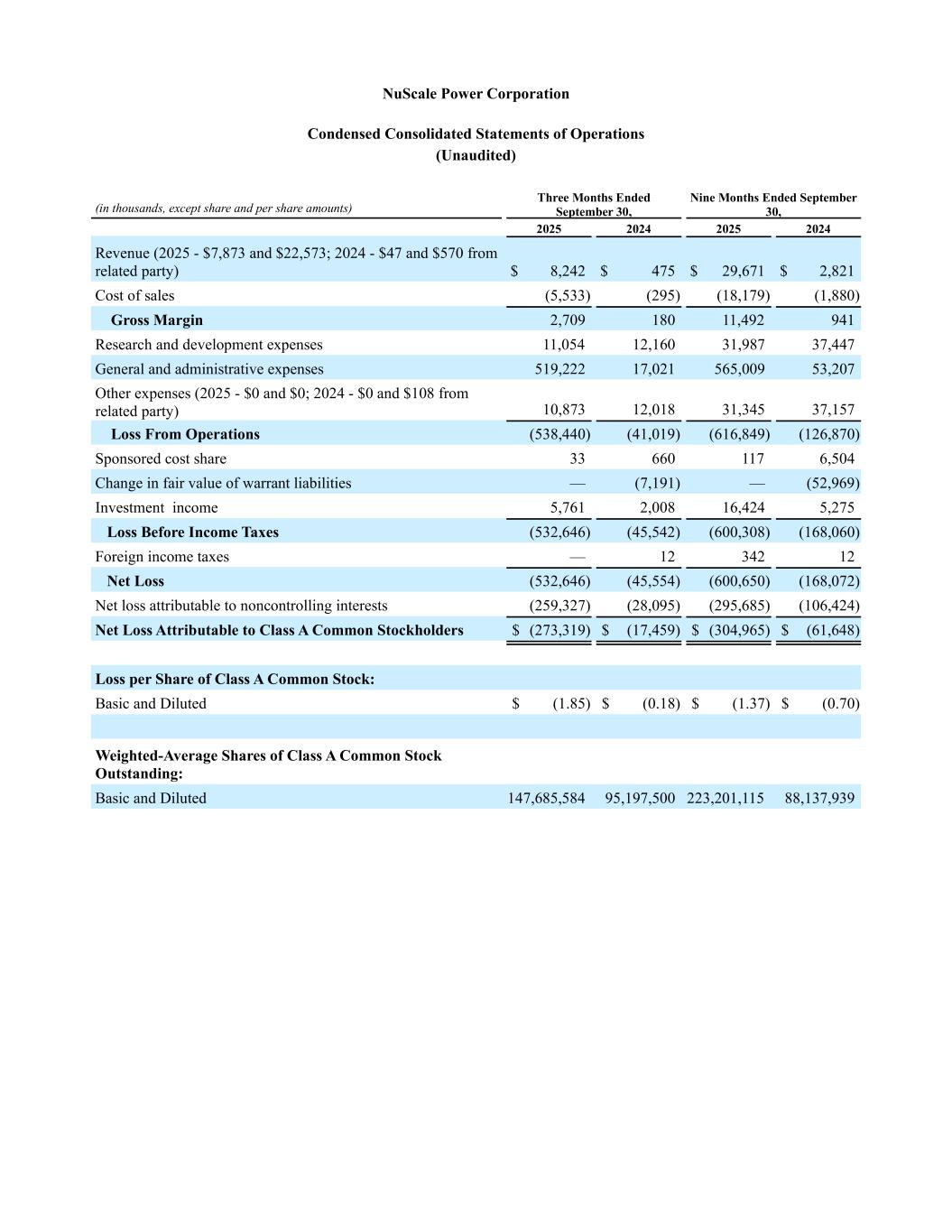 NuScale Power Corporation Condensed Consolidated Statements of Operations (Unaudited) (in thousands, except share and per share amounts) Three Months Ended September 30, Nine Months Ended September 30, 2025 2024 2025 2024 Revenue (2025 - $7,873 and $22,573; 2024 - $47 and $570 from related party) $ 8,242 $ 475 $ 29,671 $ 2,821 Cost of sales (5,533) (295) (18,179) (1,880) Gross Margin 2,709 180 11,492 941 Research and development expenses 11,054 12,160 31,987 37,447 General and administrative expenses 519,222 17,021 565,009 53,207 Other expenses (2025 - $0 and $0; 2024 - $0 and $108 from related party) 10,873 12,018 31,345 37,157 Loss From Operations (538,440) (41,019) (616,849) (126,870) Sponsored cost share 33 660 117 6,504 Change in fair value of warrant liabilities — (7,191) — (52,969) Investment income 5,761 2,008 16,424 5,275 Loss Before Income Taxes (532,646) (45,542) (600,308) (168,060) Foreign income taxes — 12 342 12 Net Loss (532,646) (45,554) (600,650) (168,072) Net loss attributable to noncontrolling interests (259,327) (28,095) (295,685) (106,424) Net Loss Attributable to Class A Common Stockholders $ (273,319) $ (17,459) $ (304,965) $ (61,648) Loss per Share of Class A Common Stock: Basic and Diluted $ (1.85) $ (0.18) $ (1.37) $ (0.70) Weighted-Average Shares of Class A Common Stock Outstanding: Basic and Diluted 147,685,584 95,197,500 223,201,115 88,137,939