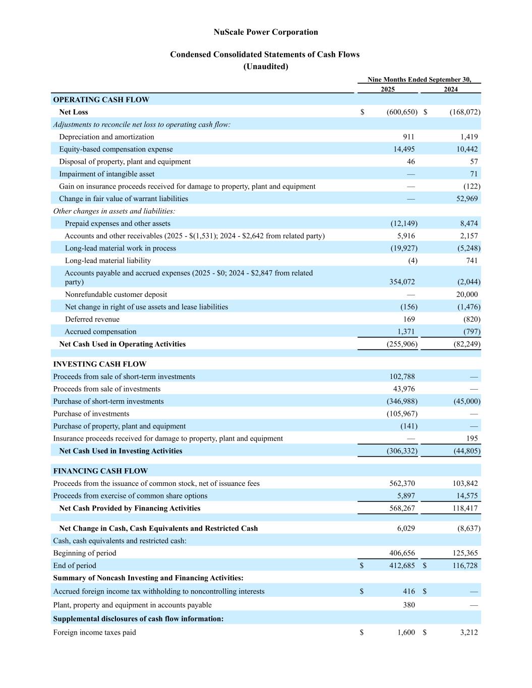 NuScale Power Corporation Condensed Consolidated Statements of Cash Flows (Unaudited) Nine Months Ended September 30, 2025 2024 OPERATING CASH FLOW Net Loss $ (600,650) $ (168,072) Adjustments to reconcile net loss to operating cash flow: Depreciation and amortization 911 1,419 Equity-based compensation expense 14,495 10,442 Disposal of property, plant and equipment 46 57 Impairment of intangible asset — 71 Gain on insurance proceeds received for damage to property, plant and equipment — (122) Change in fair value of warrant liabilities — 52,969 Other changes in assets and liabilities: Prepaid expenses and other assets (12,149) 8,474 Accounts and other receivables (2025 - $(1,531); 2024 - $2,642 from related party) 5,916 2,157 Long-lead material work in process (19,927) (5,248) Long-lead material liability (4) 741 Accounts payable and accrued expenses (2025 - $0; 2024 - $2,847 from related party) 354,072 (2,044) Nonrefundable customer deposit — 20,000 Net change in right of use assets and lease liabilities (156) (1,476) Deferred revenue 169 (820) Accrued compensation 1,371 (797) Net Cash Used in Operating Activities (255,906) (82,249) INVESTING CASH FLOW Proceeds from sale of short-term investments 102,788 — Proceeds from sale of investments 43,976 — Purchase of short-term investments (346,988) (45,000) Purchase of investments (105,967) — Purchase of property, plant and equipment (141) — Insurance proceeds received for damage to property, plant and equipment — 195 Net Cash Used in Investing Activities (306,332) (44,805) FINANCING CASH FLOW Proceeds from the issuance of common stock, net of issuance fees 562,370 103,842 Proceeds from exercise of common share options 5,897 14,575 Net Cash Provided by Financing Activities 568,267 118,417 Net Change in Cash, Cash Equivalents and Restricted Cash 6,029 (8,637) Cash, cash equivalents and restricted cash: Beginning of period 406,656 125,365 End of period $ 412,685 $ 116,728 Summary of Noncash Investing and Financing Activities: Accrued foreign income tax withholding to noncontrolling interests $ 416 $ — Plant, property and equipment in accounts payable 380 — Supplemental disclosures of cash flow information: Foreign income taxes paid $ 1,600 $ 3,212