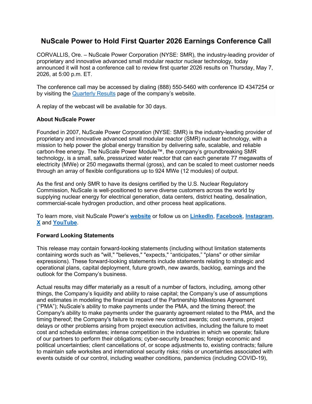 NuScale Power to Hold First Quarter 2026 Earnings Conference Call CORVALLIS, Ore. – NuScale Power Corporation (NYSE: SMR), the industry-leading provider of proprietary and innovative advanced small modular reactor nuclear technology, today announced it will host a conference call to review first quarter 2026 results on Thursday, May 7, 2026, at 5:00 p.m. ET. The conference call may be accessed by dialing (888) 550-5460 with conference ID 4347254 or by visiting the Quarterly Results page of the company’s website. A replay of the webcast will be available for 30 days. About NuScale Power Founded in 2007, NuScale Power Corporation (NYSE: SMR) is the industry-leading provider of proprietary and innovative advanced small modular reactor (SMR) nuclear technology, with a mission to help power the global energy transition by delivering safe, scalable, and reliable carbon-free energy. The NuScale Power Module™, the company’s groundbreaking SMR technology, is a small, safe, pressurized water reactor that can each generate 77 megawatts of electricity (MWe) or 250 megawatts thermal (gross), and can be scaled to meet customer needs through an array of flexible configurations up to 924 MWe (12 modules) of output. As the first and only SMR to have its designs certified by the U.S. Nuclear Regulatory Commission, NuScale is well-positioned to serve diverse customers across the world by supplying nuclear energy for electrical generation, data centers, district heating, desalination, commercial-scale hydrogen production, and other process heat applications. To learn more, visit NuScale Power’s website or follow us on LinkedIn, Facebook, Instagram, X and YouTube. Forward Looking Statements This release may contain forward-looking statements (including without limitation statements containing words such as "will," "believes," "expects," “anticipates,” "plans" or other similar expressions). These forward-looking statements include statements relating to strategic and operational plans, capital deployment, future growth, new awards, backlog, earnings and the outlook for the Company’s business. Actual results may differ materially as a result of a number of factors, including, among other things, the Company’s liquidity and ability to raise capital; the Company’s use of assumptions and estimates in modeling the financial impact of the Partnership Milestones Agreement (“PMA”); NuScale’s ability to make payments under the PMA, and the timing thereof; the Company's ability to make payments under the guaranty agreement related to the PMA, and the timing thereof; the Company's failure to receive new contract awards; cost overruns, project delays or other problems arising from project execution activities, including the failure to meet cost and schedule estimates; intense competition in the industries in which we operate; failure of our partners to perform their obligations; cyber-security breaches; foreign economic and political uncertainties; client cancellations of, or scope adjustments to, existing contracts; failure to maintain safe worksites and international security risks; risks or uncertainties associated with events outside of our control, including weather conditions, pandemics (including COVID-19),