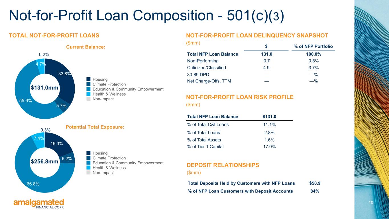 9 Loans Held for Investment TOTAL LOANS ($bn) 4.42 4.47 4.55 4.67 4.68 4.76% 4.68% 4.79% 5.00% 5.00% Loan Yield 1Q24 2Q24 3Q24 4Q24 1Q25 1.4 1.4 1.4 1.3 1.3 1.2 1.2 1.3 1.4 1.4 1.0 1.0 1.1 1.2 1.2 0.4 0.4 0.4 0.4 0.4 0.4 0.4 0.4 0.4 0.4 Residential Multifamily C&I Consumer/other CRE and Land 1Q24 2Q24 3Q24 4Q24 1Q25 LOAN COMPOSITION ($bn) 87% 35% 82% 92% 13% 65% 18% 8% % Mission Aligned Loans % Non-Impact Loans Multifamily CRE and Land C&I Consumer/Other MISSION-ALIGNED LOAN COMPOSITION1,2,3 (%) 1 Does not include residential or HELOC loans 2 For more detail on the mission-aligned loan portfolio, please refer to slides 24-25 3 For additional relevant data points, please refer to the Metrics Index slides on Appendix pages 28-29