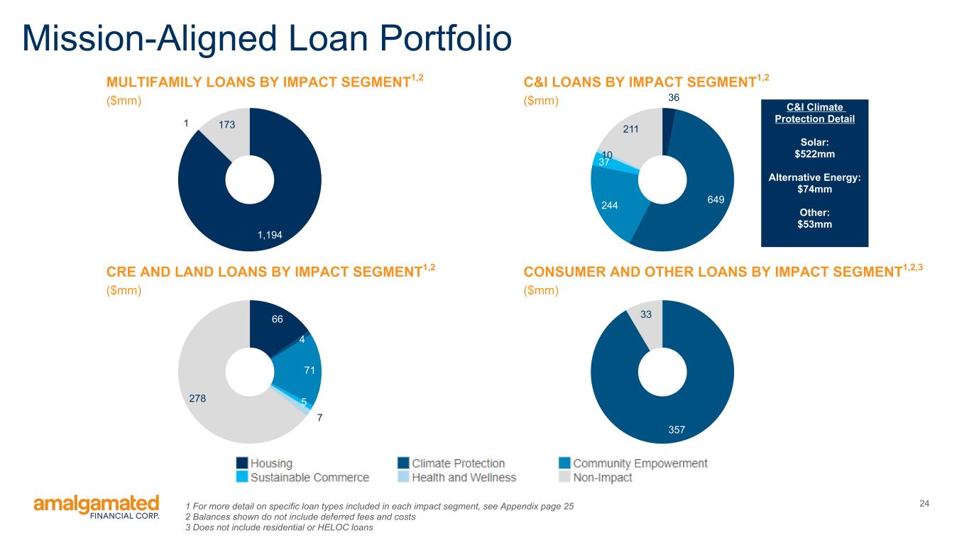 241 For more detail on specific loan types included in each impact segment, see Appendix page 25 2 Balances shown do not include deferred fees and costs 3 Does not include residential or HELOC loans Mission-Aligned Loan Portfolio 1,194 1 173 CRE AND LAND LOANS BY IMPACT SEGMENT1,2 ($mm) 66 4 71 5 7 278 C&I LOANS BY IMPACT SEGMENT1,2 ($mm) 36 649244 37 10 211 CONSUMER AND OTHER LOANS BY IMPACT SEGMENT1,2,3 ($mm) 357 33 C&I Climate Protection Detail Solar: $522mm Alternative Energy: $74mm Other: $53mm MULTIFAMILY LOANS BY IMPACT SEGMENT1,2 ($mm)