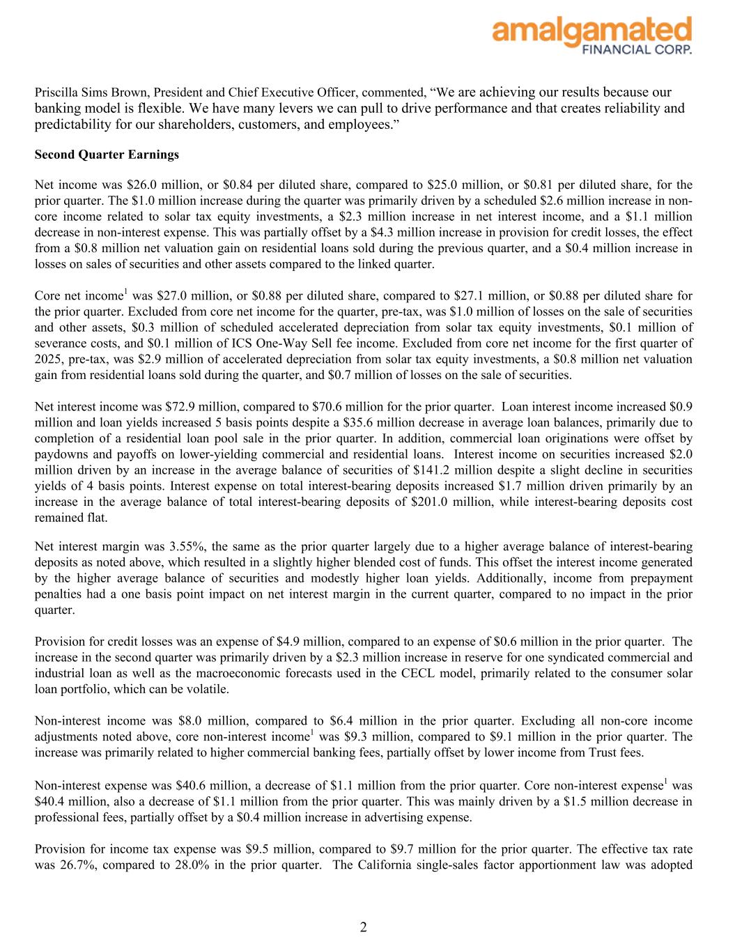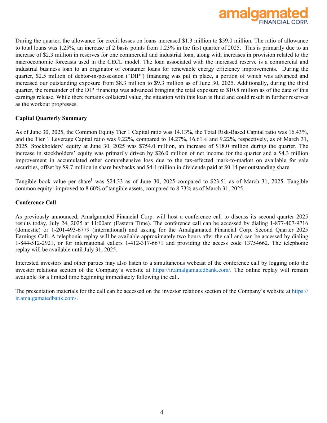 During the quarter, the allowance for credit losses on loans increased $1.3 million to $59.0 million. The ratio of allowance to total loans was 1.25%, an increase of 2 basis points from 1.23% in the first quarter of 2025. This is primarily due to an increase of $2.3 million in reserves for one commercial and industrial loan, along with increases in provision related to the macroeconomic forecasts used in the CECL model. The loan associated with the increased reserve is a commercial and industrial business loan to an originator of consumer loans for renewable energy efficiency improvements. During the quarter, $2.5 million of debtor-in-possession (“DIP”) financing was put in place, a portion of which was advanced and increased our outstanding exposure from $8.3 million to $9.3 million as of June 30, 2025. Additionally, during the third quarter, the remainder of the DIP financing was advanced bringing the total exposure to $10.8 million as of the date of this earnings release. While there remains collateral value, the situation with this loan is fluid and could result in further reserves as the workout progresses. Capital Quarterly Summary As of June 30, 2025, the Common Equity Tier 1 Capital ratio was 14.13%, the Total Risk-Based Capital ratio was 16.43%, and the Tier 1 Leverage Capital ratio was 9.22%, compared to 14.27%, 16.61% and 9.22%, respectively, as of March 31, 2025. Stockholders’ equity at June 30, 2025 was $754.0 million, an increase of $18.0 million during the quarter. The increase in stockholders’ equity was primarily driven by $26.0 million of net income for the quarter and a $4.3 million improvement in accumulated other comprehensive loss due to the tax-effected mark-to-market on available for sale securities, offset by $9.7 million in share buybacks and $4.4 million in dividends paid at $0.14 per outstanding share. Tangible book value per share1 was $24.33 as of June 30, 2025 compared to $23.51 as of March 31, 2025. Tangible common equity1 improved to 8.60% of tangible assets, compared to 8.73% as of March 31, 2025. Conference Call As previously announced, Amalgamated Financial Corp. will host a conference call to discuss its second quarter 2025 results today, July 24, 2025 at 11:00am (Eastern Time). The conference call can be accessed by dialing 1-877-407-9716 (domestic) or 1-201-493-6779 (international) and asking for the Amalgamated Financial Corp. Second Quarter 2025 Earnings Call. A telephonic replay will be available approximately two hours after the call and can be accessed by dialing 1-844-512-2921, or for international callers 1-412-317-6671 and providing the access code 13754662. The telephonic replay will be available until July 31, 2025. Interested investors and other parties may also listen to a simultaneous webcast of the conference call by logging onto the investor relations section of the Company’s website at https://ir.amalgamatedbank.com/. The online replay will remain available for a limited time beginning immediately following the call. The presentation materials for the call can be accessed on the investor relations section of the Company’s website at https:// ir.amalgamatedbank.com/. 4