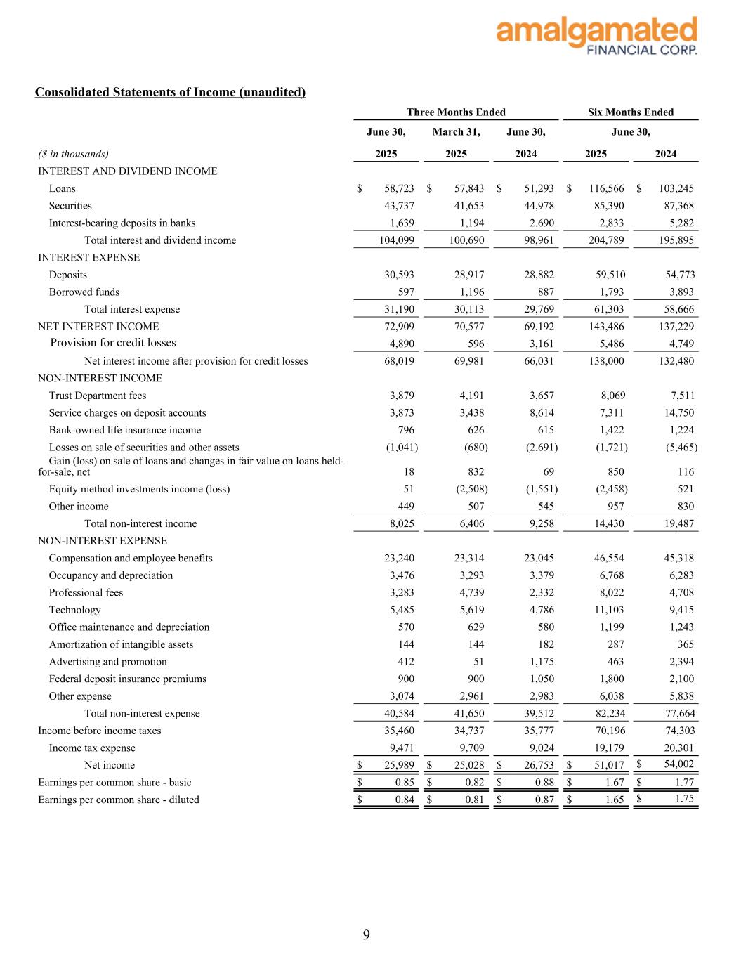 About Amalgamated Financial Corp. Amalgamated Financial Corp. is a Delaware public benefit corporation and a bank holding company engaged in commercial banking and financial services through its wholly-owned subsidiary, Amalgamated Bank. Amalgamated Bank is a New York-based full-service commercial bank and a chartered trust company with a combined network of five branches across New York City, Washington D.C., and San Francisco, and a commercial office in Boston. Amalgamated Bank was formed in 1923 as Amalgamated Bank of New York by the Amalgamated Clothing Workers of America, one of the country's oldest labor unions. Amalgamated Bank provides commercial banking and trust services nationally and offers a full range of products and services to both commercial and retail customers. Amalgamated Bank is a proud member of the Global Alliance for Banking on Values and is a certified B Corporation®. As of June 30, 2025, total assets were $8.6 billion, total net loans were $4.7 billion, and total deposits were $7.7 billion. Additionally, as of June 30, 2025, the trust business held $36.5 billion in assets under custody and $15.6 billion in assets under management. Non-GAAP Financial Measures This release (and the accompanying financial information and tables) refer to certain non-GAAP financial measures including, without limitation, “Core operating revenue,” “Core non-interest expense,” “Core non-interest income,” “Core net income,” “Tangible common equity,” “Average tangible common equity,” “Core return on average assets,” “Core return on average tangible common equity,” and “Core efficiency ratio.” Management utilizes this information to compare operating performance for June 30, 2025 versus certain periods in 2025 and 2024 and to prepare internal projections. The Company believes these non-GAAP financial measures facilitate making period-to-period comparisons and are meaningful indications of operating performance. In addition, because intangible assets such as goodwill and other discrete items unrelated to core business, which are excluded, vary extensively from company to company, the Company believe that the presentation of this information allows investors to more easily compare results to those of other companies. The presentation of non-GAAP financial information, however, is not intended to be considered in isolation or as a substitute for GAAP financial measures. The Company strongly encourage readers to review the GAAP financial measures included in this release and not to place undue reliance upon any single financial measure. In addition, because non-GAAP financial measures are not standardized, it may not be possible to compare the non-GAAP financial measures presented in this release with other companies’ non-GAAP financial measures having the same or similar names. Reconciliations of non- GAAP financial disclosures to comparable GAAP measures found in this release are set forth in the final pages of this release and also may be viewed on the Company’s website, amalgamatedbank.com. Terminology Certain terms used in this release are defined as follows: “Core efficiency ratio” is defined as “Core non-interest expense” divided by “Core operating revenue.” The Company believes the most directly comparable performance ratio derived from GAAP financial measures is an efficiency ratio calculated by dividing total non-interest expense by the sum of net interest income and total non-interest income. “Core net income” is defined as net income after tax excluding gains and losses on sales of securities, ICS One-Way Sell fee income, changes in fair value on loans held-for-sale, gains on the sale of owned property, costs related to branch closures, restructuring/severance costs, acquisition costs, tax credits and accelerated depreciation on solar equity investments, and taxes on notable pre-tax items. The Company believes the most directly comparable GAAP financial measure is net income. 5