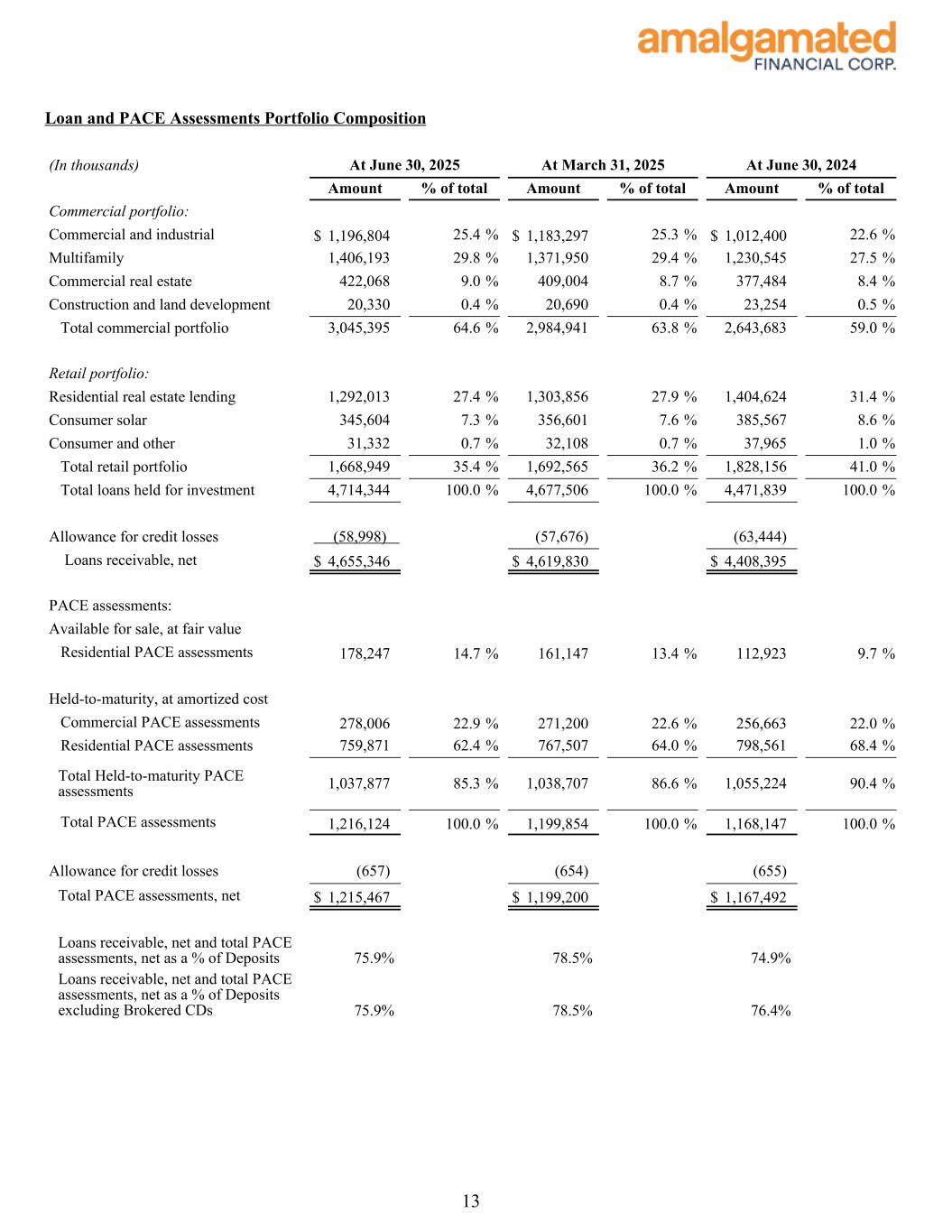 Loan and PACE Assessments Portfolio Composition (In thousands) At June 30, 2025 At March 31, 2025 At June 30, 2024 Amount % of total Amount % of total Amount % of total Commercial portfolio: Commercial and industrial $ 1,196,804 25.4 % $ 1,183,297 25.3 % $ 1,012,400 22.6 % Multifamily 1,406,193 29.8 % 1,371,950 29.4 % 1,230,545 27.5 % Commercial real estate 422,068 9.0 % 409,004 8.7 % 377,484 8.4 % Construction and land development 20,330 0.4 % 20,690 0.4 % 23,254 0.5 % Total commercial portfolio 3,045,395 64.6 % 2,984,941 63.8 % 2,643,683 59.0 % Retail portfolio: Residential real estate lending 1,292,013 27.4 % 1,303,856 27.9 % 1,404,624 31.4 % Consumer solar 345,604 7.3 % 356,601 7.6 % 385,567 8.6 % Consumer and other 31,332 0.7 % 32,108 0.7 % 37,965 1.0 % Total retail portfolio 1,668,949 35.4 % 1,692,565 36.2 % 1,828,156 41.0 % Total loans held for investment 4,714,344 100.0 % 4,677,506 100.0 % 4,471,839 100.0 % Allowance for credit losses (58,998) (57,676) (63,444) Loans receivable, net $ 4,655,346 $ 4,619,830 $ 4,408,395 PACE assessments: Available for sale, at fair value Residential PACE assessments 178,247 14.7 % 161,147 13.4 % 112,923 9.7 % Held-to-maturity, at amortized cost Commercial PACE assessments 278,006 22.9 % 271,200 22.6 % 256,663 22.0 % Residential PACE assessments 759,871 62.4 % 767,507 64.0 % 798,561 68.4 % Total Held-to-maturity PACE assessments 1,037,877 85.3 % 1,038,707 86.6 % 1,055,224 90.4 % Total PACE assessments 1,216,124 100.0 % 1,199,854 100.0 % 1,168,147 100.0 % Allowance for credit losses (657) (654) (655) Total PACE assessments, net $ 1,215,467 $ 1,199,200 $ 1,167,492 Loans receivable, net and total PACE assessments, net as a % of Deposits 75.9% 78.5% 74.9% Loans receivable, net and total PACE assessments, net as a % of Deposits excluding Brokered CDs 75.9% 78.5% 76.4% 13