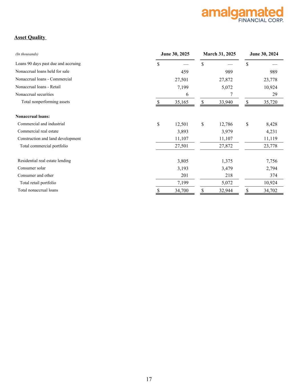 Asset Quality (In thousands) June 30, 2025 March 31, 2025 June 30, 2024 Loans 90 days past due and accruing $ — $ — $ — Nonaccrual loans held for sale 459 989 989 Nonaccrual loans - Commercial 27,501 27,872 23,778 Nonaccrual loans - Retail 7,199 5,072 10,924 Nonaccrual securities 6 7 29 Total nonperforming assets $ 35,165 $ 33,940 $ 35,720 Nonaccrual loans: Commercial and industrial $ 12,501 $ 12,786 $ 8,428 Commercial real estate 3,893 3,979 4,231 Construction and land development 11,107 11,107 11,119 Total commercial portfolio 27,501 27,872 23,778 Residential real estate lending 3,805 1,375 7,756 Consumer solar 3,193 3,479 2,794 Consumer and other 201 218 374 Total retail portfolio 7,199 5,072 10,924 Total nonaccrual loans $ 34,700 $ 32,944 $ 34,702 17