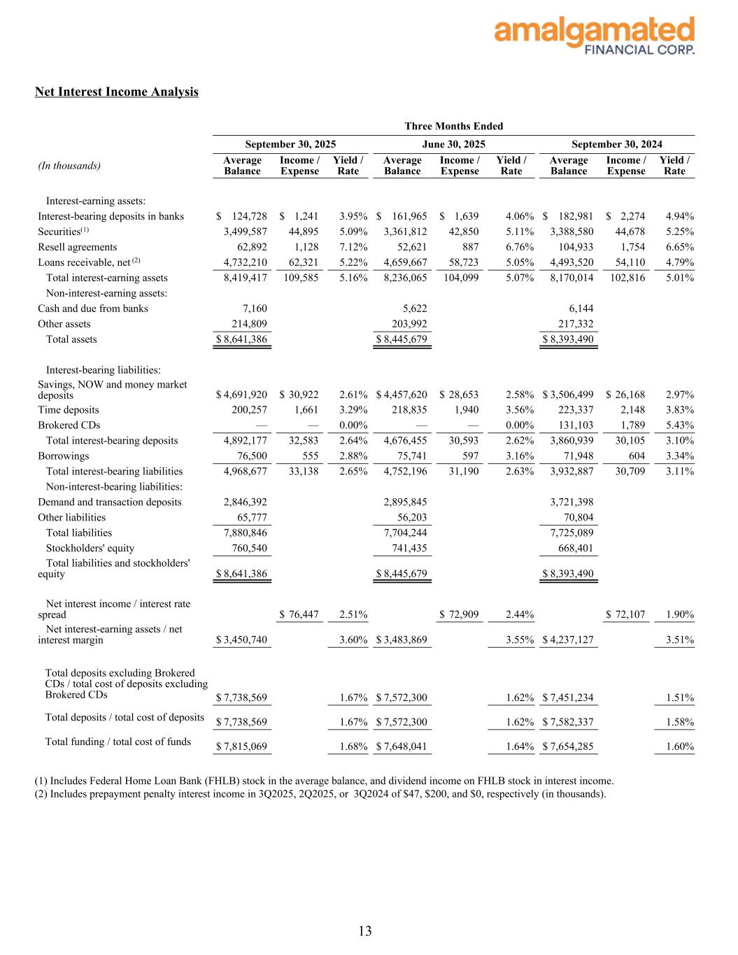 Capital Quarterly Summary As of September 30, 2025, the Common Equity Tier 1 Capital ratio was 14.21%, the Total Risk-Based Capital ratio was 16.41%, and the Tier 1 Leverage Capital ratio was 9.18%, compared to 14.13%, 16.43% and 9.22%, respectively, as of June 30, 2025. Stockholders’ equity at September 30, 2025 was $775.6 million, an increase of $21.6 million during the quarter. The increase in stockholders’ equity was primarily driven by $26.8 million of net income for the quarter and a $7.8 million improvement in accumulated other comprehensive loss due to the tax-effected mark-to-market adjustment on available for sale securities, offset by $10.4 million in share buybacks and $4.3 million in dividends paid at $0.14 per outstanding share. Tangible book value per share1 was $25.31 as of September 30, 2025 compared to $24.33 as of June 30, 2025. Tangible common equity1 improved to 8.79% of tangible assets, compared to 8.60% as of June 30, 2025. Conference Call As previously announced, Amalgamated Financial Corp. will host a conference call to discuss its third quarter 2025 results today, October 23, 2025 at 11:00am (Eastern Time). The conference call can be accessed by dialing 1-877-407-9716 (domestic) or 1-201-493-6779 (international) and asking for the Amalgamated Financial Corp. Third Quarter 2025 Earnings Call. A telephonic replay will be available approximately two hours after the call and can be accessed by dialing 1-844-512-2921, or for international callers 1-412-317-6671 and providing the access code 13755783. The telephonic replay will be available until October 30, 2025. Interested investors and other parties may also listen to a simultaneous webcast of the conference call by logging onto the investor relations section of the Company’s website at https://ir.amalgamatedbank.com/. The online replay will remain available for a limited time beginning immediately following the call. The presentation materials for the call can be accessed on the investor relations section of the Company’s website at https:// ir.amalgamatedbank.com/. About Amalgamated Financial Corp. Amalgamated Financial Corp. is a Delaware public benefit corporation and a bank holding company engaged in commercial banking and financial services through its wholly-owned subsidiary, Amalgamated Bank. Amalgamated Bank is a New York-based full-service commercial bank and a chartered trust company with a combined network of five branches across New York City, Washington D.C., and San Francisco, and a commercial office in Boston. Amalgamated Bank was formed in 1923 as Amalgamated Bank of New York by the Amalgamated Clothing Workers of America, one of the country's oldest labor unions. Amalgamated Bank provides commercial banking and trust services nationally and offers a full range of products and services to both commercial and retail customers. Amalgamated Bank is a proud member of the Global Alliance for Banking on Values and is a certified B Corporation®. As of September 30, 2025, total assets were $8.7 billion, total net loans were $4.7 billion, and total deposits were $7.8 billion. Additionally, as of September 30, 2025, the trust business held $37.9 billion in assets under custody and $16.6 billion in assets under management. Non-GAAP Financial Measures This release (and the accompanying financial information and tables) refer to certain non-GAAP financial measures including, without limitation, “Core operating revenue,” “Core non-interest expense,” “Core non-interest income,” “Core net income,” “Tangible common equity,” “Average tangible common equity,” “Core return on average assets,” “Core return on average tangible common equity,” and “Core efficiency ratio.” 4