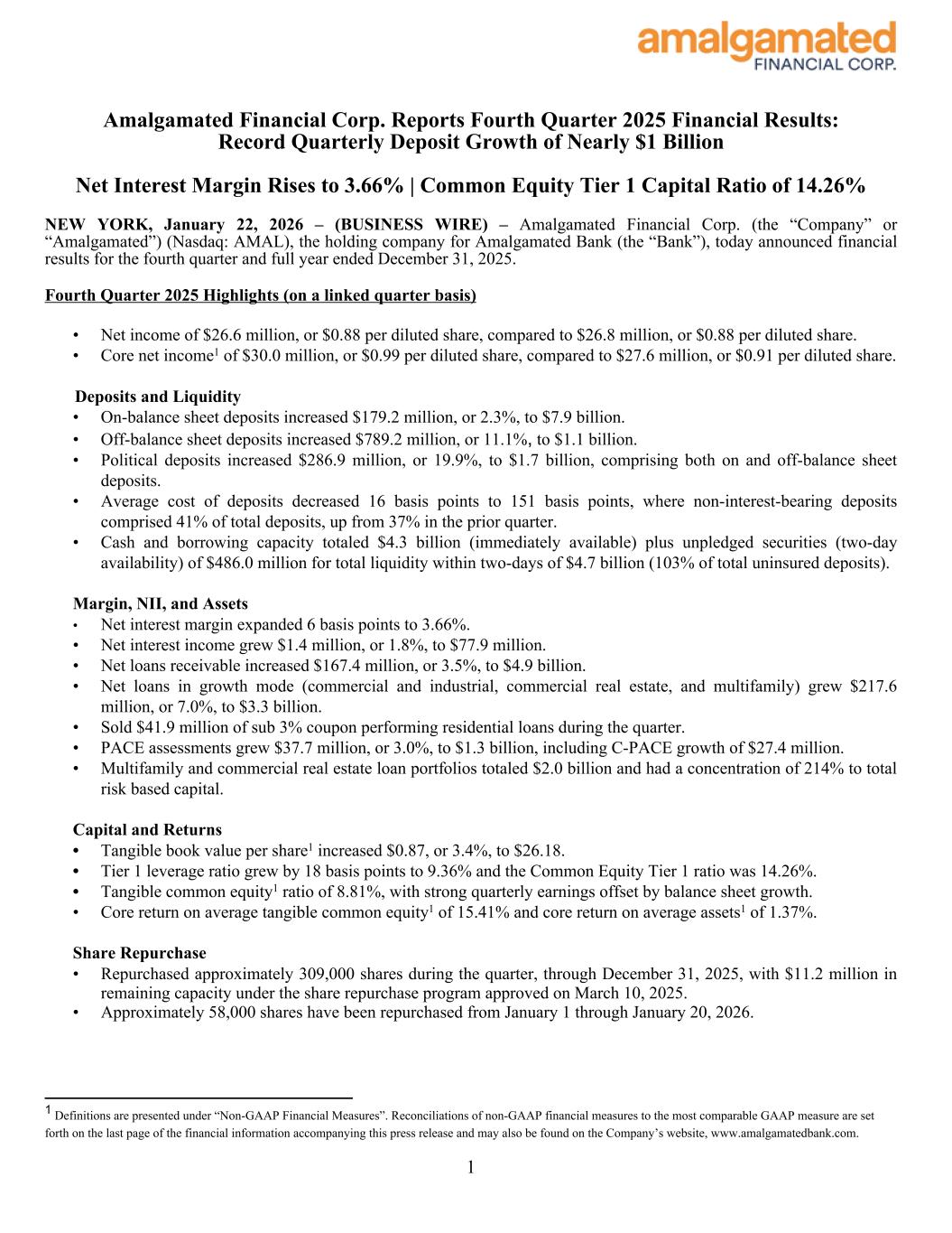 Amalgamated Financial Corp. Reports Fourth Quarter 2025 Financial Results: Record Quarterly Deposit Growth of Nearly $1 Billion Net Interest Margin Rises to 3.66% | Common Equity Tier 1 Capital Ratio of 14.26% NEW YORK, January 22, 2026 – (BUSINESS WIRE) – Amalgamated Financial Corp. (the “Company” or “Amalgamated”) (Nasdaq: AMAL), the holding company for Amalgamated Bank (the “Bank”), today announced financial results for the fourth quarter and full year ended December 31, 2025. Fourth Quarter 2025 Highlights (on a linked quarter basis) • Net income of $26.6 million, or $0.88 per diluted share, compared to $26.8 million, or $0.88 per diluted share. • Core net income1 of $30.0 million, or $0.99 per diluted share, compared to $27.6 million, or $0.91 per diluted share. Deposits and Liquidity • On-balance sheet deposits increased $179.2 million, or 2.3%, to $7.9 billion. • Off-balance sheet deposits increased $789.2 million, or 11.1%, to $1.1 billion. • Political deposits increased $286.9 million, or 19.9%, to $1.7 billion, comprising both on and off-balance sheet deposits. • Average cost of deposits decreased 16 basis points to 151 basis points, where non-interest-bearing deposits comprised 41% of total deposits, up from 37% in the prior quarter. • Cash and borrowing capacity totaled $4.3 billion (immediately available) plus unpledged securities (two-day availability) of $486.0 million for total liquidity within two-days of $4.7 billion (103% of total uninsured deposits). Margin, NII, and Assets • Net interest margin expanded 6 basis points to 3.66%. • Net interest income grew $1.4 million, or 1.8%, to $77.9 million. • Net loans receivable increased $167.4 million, or 3.5%, to $4.9 billion. • Net loans in growth mode (commercial and industrial, commercial real estate, and multifamily) grew $217.6 million, or 7.0%, to $3.3 billion. • Sold $41.9 million of sub 3% coupon performing residential loans during the quarter. • PACE assessments grew $37.7 million, or 3.0%, to $1.3 billion, including C-PACE growth of $27.4 million. • Multifamily and commercial real estate loan portfolios totaled $2.0 billion and had a concentration of 214% to total risk based capital. Capital and Returns • Tangible book value per share1 increased $0.87, or 3.4%, to $26.18. • Tier 1 leverage ratio grew by 18 basis points to 9.36% and the Common Equity Tier 1 ratio was 14.26%. • Tangible common equity1 ratio of 8.81%, with strong quarterly earnings offset by balance sheet growth. • Core return on average tangible common equity1 of 15.41% and core return on average assets1 of 1.37%. Share Repurchase • Repurchased approximately 309,000 shares during the quarter, through December 31, 2025, with $11.2 million in remaining capacity under the share repurchase program approved on March 10, 2025. • Approximately 58,000 shares have been repurchased from January 1 through January 20, 2026. 1 1 Definitions are presented under “Non-GAAP Financial Measures”. Reconciliations of non-GAAP financial measures to the most comparable GAAP measure are set forth on the last page of the financial information accompanying this press release and may also be found on the Company’s website, www.amalgamatedbank.com.