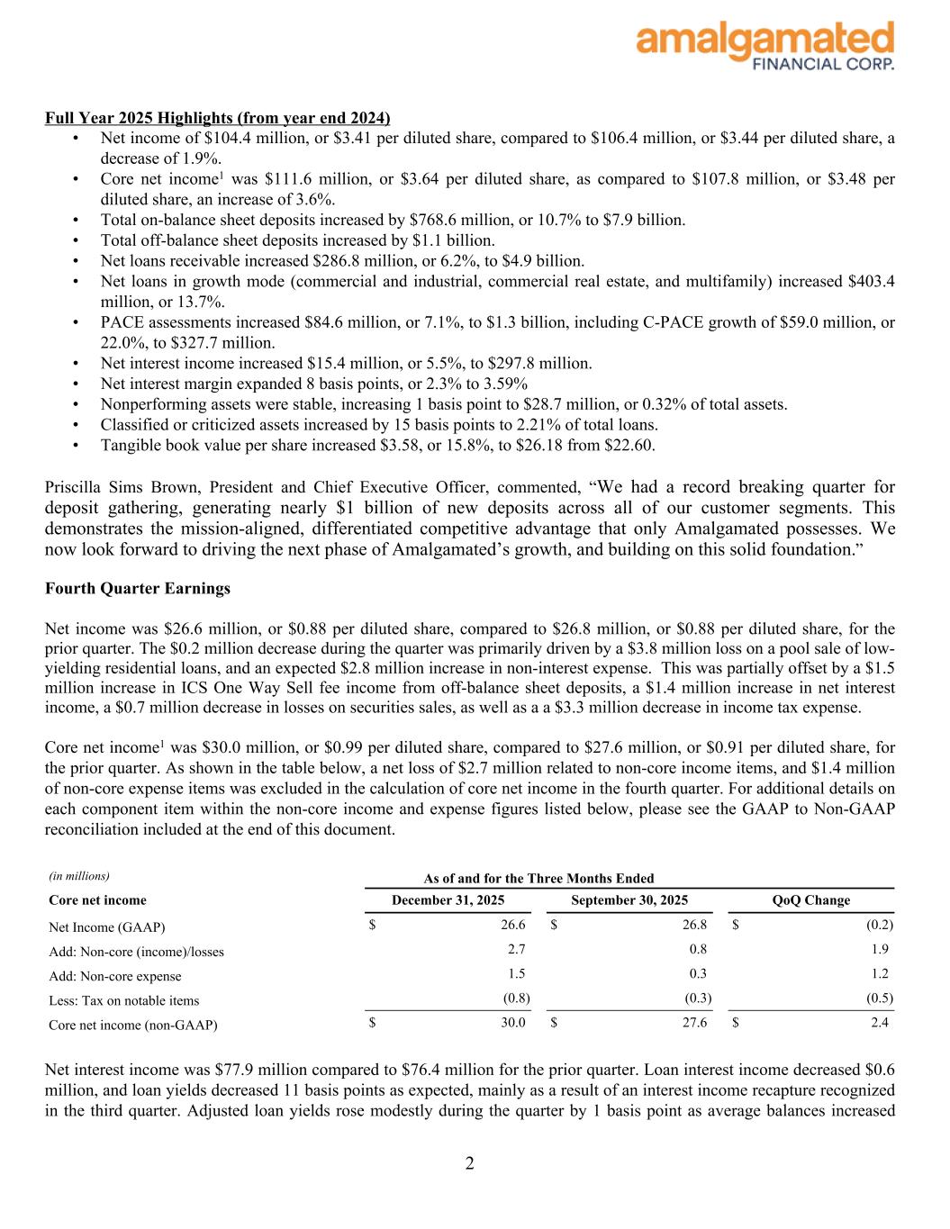 Full Year 2025 Highlights (from year end 2024) • Net income of $104.4 million, or $3.41 per diluted share, compared to $106.4 million, or $3.44 per diluted share, a decrease of 1.9%. • Core net income1 was $111.6 million, or $3.64 per diluted share, as compared to $107.8 million, or $3.48 per diluted share, an increase of 3.6%. • Total on-balance sheet deposits increased by $768.6 million, or 10.7% to $7.9 billion. • Total off-balance sheet deposits increased by $1.1 billion. • Net loans receivable increased $286.8 million, or 6.2%, to $4.9 billion. • Net loans in growth mode (commercial and industrial, commercial real estate, and multifamily) increased $403.4 million, or 13.7%. • PACE assessments increased $84.6 million, or 7.1%, to $1.3 billion, including C-PACE growth of $59.0 million, or 22.0%, to $327.7 million. • Net interest income increased $15.4 million, or 5.5%, to $297.8 million. • Net interest margin expanded 8 basis points, or 2.3% to 3.59% • Nonperforming assets were stable, increasing 1 basis point to $28.7 million, or 0.32% of total assets. • Classified or criticized assets increased by 15 basis points to 2.21% of total loans. • Tangible book value per share increased $3.58, or 15.8%, to $26.18 from $22.60. Priscilla Sims Brown, President and Chief Executive Officer, commented, “We had a record breaking quarter for deposit gathering, generating nearly $1 billion of new deposits across all of our customer segments. This demonstrates the mission-aligned, differentiated competitive advantage that only Amalgamated possesses. We now look forward to driving the next phase of Amalgamated’s growth, and building on this solid foundation.” Fourth Quarter Earnings Net income was $26.6 million, or $0.88 per diluted share, compared to $26.8 million, or $0.88 per diluted share, for the prior quarter. The $0.2 million decrease during the quarter was primarily driven by a $3.8 million loss on a pool sale of low- yielding residential loans, and an expected $2.8 million increase in non-interest expense. This was partially offset by a $1.5 million increase in ICS One Way Sell fee income from off-balance sheet deposits, a $1.4 million increase in net interest income, a $0.7 million decrease in losses on securities sales, as well as a a $3.3 million decrease in income tax expense. Core net income1 was $30.0 million, or $0.99 per diluted share, compared to $27.6 million, or $0.91 per diluted share, for the prior quarter. As shown in the table below, a net loss of $2.7 million related to non-core income items, and $1.4 million of non-core expense items was excluded in the calculation of core net income in the fourth quarter. For additional details on each component item within the non-core income and expense figures listed below, please see the GAAP to Non-GAAP reconciliation included at the end of this document. (in millions) As of and for the Three Months Ended Core net income December 31, 2025 September 30, 2025 QoQ Change Net Income (GAAP) $ 26.6 $ 26.8 $ (0.2) Add: Non-core (income)/losses 2.7 0.8 1.9 Add: Non-core expense 1.5 0.3 1.2 Less: Tax on notable items (0.8) (0.3) (0.5) Core net income (non-GAAP) $ 30.0 $ 27.6 $ 2.4 Net interest income was $77.9 million compared to $76.4 million for the prior quarter. Loan interest income decreased $0.6 million, and loan yields decreased 11 basis points as expected, mainly as a result of an interest income recapture recognized in the third quarter. Adjusted loan yields rose modestly during the quarter by 1 basis point as average balances increased 2