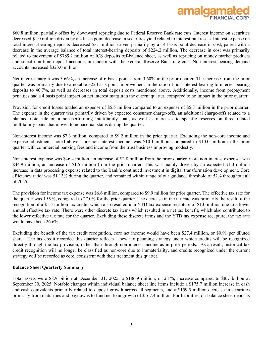 $60.8 million, partially offset by downward repricing due to Federal Reserve Bank rate cuts. Interest income on securities decreased $1.0 million driven by a 4 basis point decrease in securities yield related to interest rate resets. Interest expense on total interest-bearing deposits decreased $3.1 million driven primarily by a 14 basis point decrease in cost, paired with a decrease in the average balance of total interest-bearing deposits of $224.2 million. The decrease in cost was primarily related to movement of $789.2 million of ICS deposits off-balance sheet, as well as repricing on money market products and select non-time deposit accounts in tandem with the Federal Reserve Bank rate cuts. Non-interest bearing demand accounts increased $323.0 million. Net interest margin was 3.66%, an increase of 6 basis points from 3.60% in the prior quarter. The increase from the prior quarter was primarily due to a notable 322 basis point improvement in the ratio of non-interest bearing to interest-bearing deposits to 40.7%, as well as decreases in total deposit costs mentioned above. Additionally, income from prepayment penalties had a 4 basis point impact on net interest margin in the current quarter, compared to no impact in the prior quarter. Provision for credit losses totaled an expense of $5.5 million compared to an expense of $5.3 million in the prior quarter. The expense in the quarter was primarily driven by expected consumer charge-offs, an additional charge-offs related to a planned note sale on a non-performing multifamily loan, as well as increases to specific reserves on three related multifamily loans that moved to nonaccrual status during the quarter. Non-interest income was $7.3 million, compared to $9.2 million in the prior quarter. Excluding the non-core income and expense adjustments noted above, core non-interest income1 was $10.1 million, compared to $10.0 million in the prior quarter with commercial banking fees and income from the trust business improving modestly. Non-interest expense was $46.4 million, an increase of $2.8 million from the prior quarter. Core non-interest expense1 was $44.9 million, an increase of $1.5 million from the prior quarter. This was mainly driven by an expected $1.0 million increase in data processing expense related to the Bank’s continued investment in digital transformation development. Core efficiency ratio1 was 51.13% during the quarter, and remained within range of our guidance threshold of 52% throughout all of 2025. The provision for income tax expense was $6.6 million, compared to $9.9 million for prior quarter. The effective tax rate for the quarter was 19.9%, compared to 27.0% for the prior quarter. The decrease in the tax rate was primarily the result of the recognition of a $1.5 million tax credit, which also resulted in a YTD tax expense recapture of $1.0 million due to a lower annual effective tax rate. There were other discrete tax items which resulted in a net tax benefit, which also contributed to the lower effective tax rate for the quarter. Excluding these discrete items and the YTD tax expense recapture, the tax rate would have been 26.6%. Excluding the benefit of the tax credit recognition, core net income would have been $27.4 million, or $0.91 per diluted share. The tax credit recorded this quarter reflects a new tax planning strategy under which credits will be recognized directly through the tax provision, rather than through non-interest income as in prior periods. As a result, historical tax credit recognition will no longer be classified as non-core due to immateriality, and credits recognized under the current strategy will be recorded as core, consistent with their treatment this quarter. Balance Sheet Quarterly Summary Total assets were $8.9 billion at December 31, 2025, a $186.9 million, or 2.1%, increase compared to $8.7 billion at September 30, 2025. Notable changes within individual balance sheet line items include a $175.7 million increase in cash and cash equivalents primarily related to deposit growth across all segments, and a $159.5 million decrease in securities primarily from maturities and paydowns to fund net loan growth of $167.4 million. For liabilities, on-balance sheet deposits 3