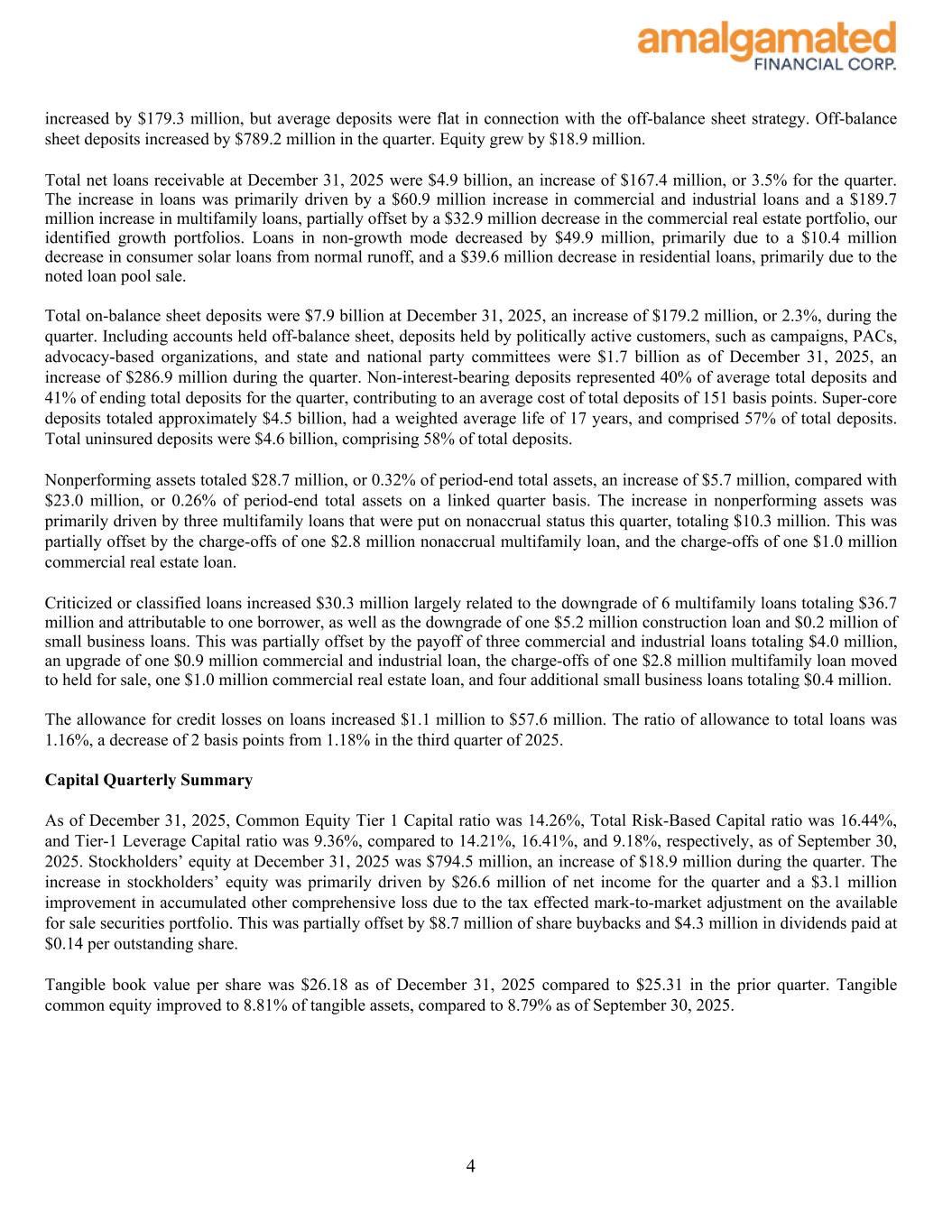 increased by $179.3 million, but average deposits were flat in connection with the off-balance sheet strategy. Off-balance sheet deposits increased by $789.2 million in the quarter. Equity grew by $18.9 million. Total net loans receivable at December 31, 2025 were $4.9 billion, an increase of $167.4 million, or 3.5% for the quarter. The increase in loans was primarily driven by a $60.9 million increase in commercial and industrial loans and a $189.7 million increase in multifamily loans, partially offset by a $32.9 million decrease in the commercial real estate portfolio, our identified growth portfolios. Loans in non-growth mode decreased by $49.9 million, primarily due to a $10.4 million decrease in consumer solar loans from normal runoff, and a $39.6 million decrease in residential loans, primarily due to the noted loan pool sale. Total on-balance sheet deposits were $7.9 billion at December 31, 2025, an increase of $179.2 million, or 2.3%, during the quarter. Including accounts held off-balance sheet, deposits held by politically active customers, such as campaigns, PACs, advocacy-based organizations, and state and national party committees were $1.7 billion as of December 31, 2025, an increase of $286.9 million during the quarter. Non-interest-bearing deposits represented 40% of average total deposits and 41% of ending total deposits for the quarter, contributing to an average cost of total deposits of 151 basis points. Super-core deposits totaled approximately $4.5 billion, had a weighted average life of 17 years, and comprised 57% of total deposits. Total uninsured deposits were $4.6 billion, comprising 58% of total deposits. Nonperforming assets totaled $28.7 million, or 0.32% of period-end total assets, an increase of $5.7 million, compared with $23.0 million, or 0.26% of period-end total assets on a linked quarter basis. The increase in nonperforming assets was primarily driven by three multifamily loans that were put on nonaccrual status this quarter, totaling $10.3 million. This was partially offset by the charge-offs of one $2.8 million nonaccrual multifamily loan, and the charge-offs of one $1.0 million commercial real estate loan. Criticized or classified loans increased $30.3 million largely related to the downgrade of 6 multifamily loans totaling $36.7 million and attributable to one borrower, as well as the downgrade of one $5.2 million construction loan and $0.2 million of small business loans. This was partially offset by the payoff of three commercial and industrial loans totaling $4.0 million, an upgrade of one $0.9 million commercial and industrial loan, the charge-offs of one $2.8 million multifamily loan moved to held for sale, one $1.0 million commercial real estate loan, and four additional small business loans totaling $0.4 million. The allowance for credit losses on loans increased $1.1 million to $57.6 million. The ratio of allowance to total loans was 1.16%, a decrease of 2 basis points from 1.18% in the third quarter of 2025. Capital Quarterly Summary As of December 31, 2025, Common Equity Tier 1 Capital ratio was 14.26%, Total Risk-Based Capital ratio was 16.44%, and Tier-1 Leverage Capital ratio was 9.36%, compared to 14.21%, 16.41%, and 9.18%, respectively, as of September 30, 2025. Stockholders’ equity at December 31, 2025 was $794.5 million, an increase of $18.9 million during the quarter. The increase in stockholders’ equity was primarily driven by $26.6 million of net income for the quarter and a $3.1 million improvement in accumulated other comprehensive loss due to the tax effected mark-to-market adjustment on the available for sale securities portfolio. This was partially offset by $8.7 million of share buybacks and $4.3 million in dividends paid at $0.14 per outstanding share. Tangible book value per share was $26.18 as of December 31, 2025 compared to $25.31 in the prior quarter. Tangible common equity improved to 8.81% of tangible assets, compared to 8.79% as of September 30, 2025. 4