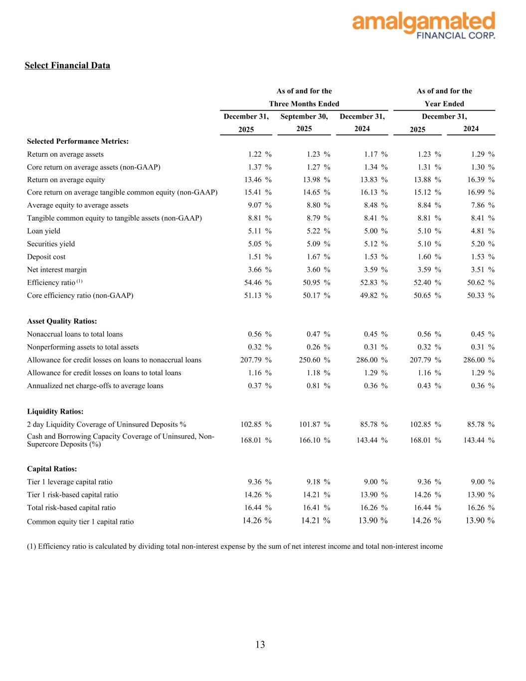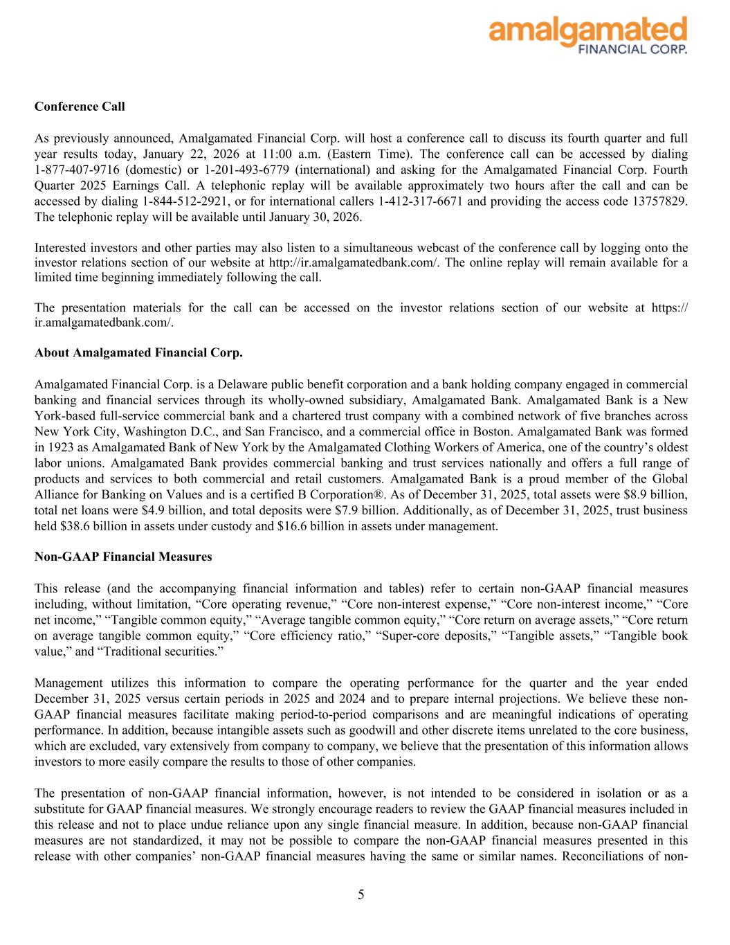 Conference Call As previously announced, Amalgamated Financial Corp. will host a conference call to discuss its fourth quarter and full year results today, January 22, 2026 at 11:00 a.m. (Eastern Time). The conference call can be accessed by dialing 1-877-407-9716 (domestic) or 1-201-493-6779 (international) and asking for the Amalgamated Financial Corp. Fourth Quarter 2025 Earnings Call. A telephonic replay will be available approximately two hours after the call and can be accessed by dialing 1-844-512-2921, or for international callers 1-412-317-6671 and providing the access code 13757829. The telephonic replay will be available until January 30, 2026. Interested investors and other parties may also listen to a simultaneous webcast of the conference call by logging onto the investor relations section of our website at http://ir.amalgamatedbank.com/. The online replay will remain available for a limited time beginning immediately following the call. The presentation materials for the call can be accessed on the investor relations section of our website at https:// ir.amalgamatedbank.com/. About Amalgamated Financial Corp. Amalgamated Financial Corp. is a Delaware public benefit corporation and a bank holding company engaged in commercial banking and financial services through its wholly-owned subsidiary, Amalgamated Bank. Amalgamated Bank is a New York-based full-service commercial bank and a chartered trust company with a combined network of five branches across New York City, Washington D.C., and San Francisco, and a commercial office in Boston. Amalgamated Bank was formed in 1923 as Amalgamated Bank of New York by the Amalgamated Clothing Workers of America, one of the country’s oldest labor unions. Amalgamated Bank provides commercial banking and trust services nationally and offers a full range of products and services to both commercial and retail customers. Amalgamated Bank is a proud member of the Global Alliance for Banking on Values and is a certified B Corporation®. As of December 31, 2025, total assets were $8.9 billion, total net loans were $4.9 billion, and total deposits were $7.9 billion. Additionally, as of December 31, 2025, trust business held $38.6 billion in assets under custody and $16.6 billion in assets under management. Non-GAAP Financial Measures This release (and the accompanying financial information and tables) refer to certain non-GAAP financial measures including, without limitation, “Core operating revenue,” “Core non-interest expense,” “Core non-interest income,” “Core net income,” “Tangible common equity,” “Average tangible common equity,” “Core return on average assets,” “Core return on average tangible common equity,” “Core efficiency ratio,” “Super-core deposits,” “Tangible assets,” “Tangible book value,” and “Traditional securities.” Management utilizes this information to compare the operating performance for the quarter and the year ended December 31, 2025 versus certain periods in 2025 and 2024 and to prepare internal projections. We believe these non- GAAP financial measures facilitate making period-to-period comparisons and are meaningful indications of operating performance. In addition, because intangible assets such as goodwill and other discrete items unrelated to the core business, which are excluded, vary extensively from company to company, we believe that the presentation of this information allows investors to more easily compare the results to those of other companies. The presentation of non-GAAP financial information, however, is not intended to be considered in isolation or as a substitute for GAAP financial measures. We strongly encourage readers to review the GAAP financial measures included in this release and not to place undue reliance upon any single financial measure. In addition, because non-GAAP financial measures are not standardized, it may not be possible to compare the non-GAAP financial measures presented in this release with other companies’ non-GAAP financial measures having the same or similar names. Reconciliations of non- 5