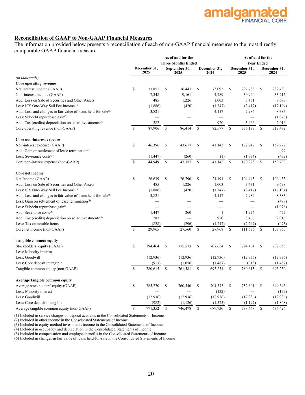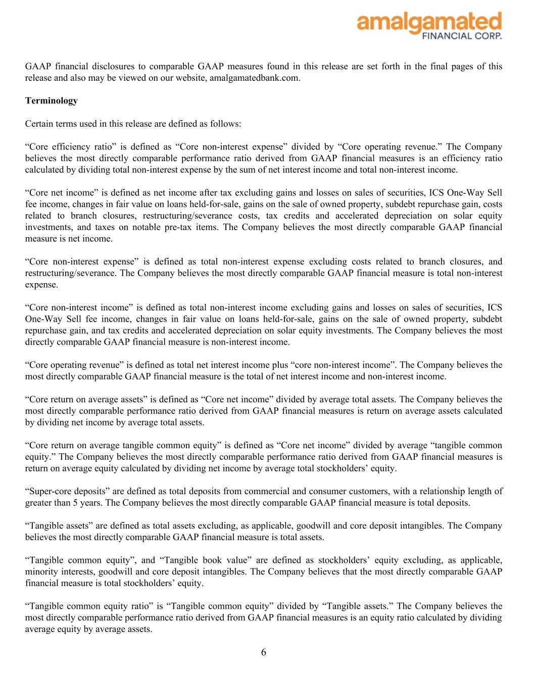 GAAP financial disclosures to comparable GAAP measures found in this release are set forth in the final pages of this release and also may be viewed on our website, amalgamatedbank.com. Terminology Certain terms used in this release are defined as follows: “Core efficiency ratio” is defined as “Core non-interest expense” divided by “Core operating revenue.” The Company believes the most directly comparable performance ratio derived from GAAP financial measures is an efficiency ratio calculated by dividing total non-interest expense by the sum of net interest income and total non-interest income. “Core net income” is defined as net income after tax excluding gains and losses on sales of securities, ICS One-Way Sell fee income, changes in fair value on loans held-for-sale, gains on the sale of owned property, subdebt repurchase gain, costs related to branch closures, restructuring/severance costs, tax credits and accelerated depreciation on solar equity investments, and taxes on notable pre-tax items. The Company believes the most directly comparable GAAP financial measure is net income. “Core non-interest expense” is defined as total non-interest expense excluding costs related to branch closures, and restructuring/severance. The Company believes the most directly comparable GAAP financial measure is total non-interest expense. “Core non-interest income” is defined as total non-interest income excluding gains and losses on sales of securities, ICS One-Way Sell fee income, changes in fair value on loans held-for-sale, gains on the sale of owned property, subdebt repurchase gain, and tax credits and accelerated depreciation on solar equity investments. The Company believes the most directly comparable GAAP financial measure is non-interest income. “Core operating revenue” is defined as total net interest income plus “core non-interest income”. The Company believes the most directly comparable GAAP financial measure is the total of net interest income and non-interest income. “Core return on average assets” is defined as “Core net income” divided by average total assets. The Company believes the most directly comparable performance ratio derived from GAAP financial measures is return on average assets calculated by dividing net income by average total assets. “Core return on average tangible common equity” is defined as “Core net income” divided by average “tangible common equity.” The Company believes the most directly comparable performance ratio derived from GAAP financial measures is return on average equity calculated by dividing net income by average total stockholders’ equity. “Super-core deposits” are defined as total deposits from commercial and consumer customers, with a relationship length of greater than 5 years. The Company believes the most directly comparable GAAP financial measure is total deposits. “Tangible assets” are defined as total assets excluding, as applicable, goodwill and core deposit intangibles. The Company believes the most directly comparable GAAP financial measure is total assets. “Tangible common equity”, and “Tangible book value” are defined as stockholders’ equity excluding, as applicable, minority interests, goodwill and core deposit intangibles. The Company believes that the most directly comparable GAAP financial measure is total stockholders’ equity. “Tangible common equity ratio” is “Tangible common equity” divided by “Tangible assets.” The Company believes the most directly comparable performance ratio derived from GAAP financial measures is an equity ratio calculated by dividing average equity by average assets. 6