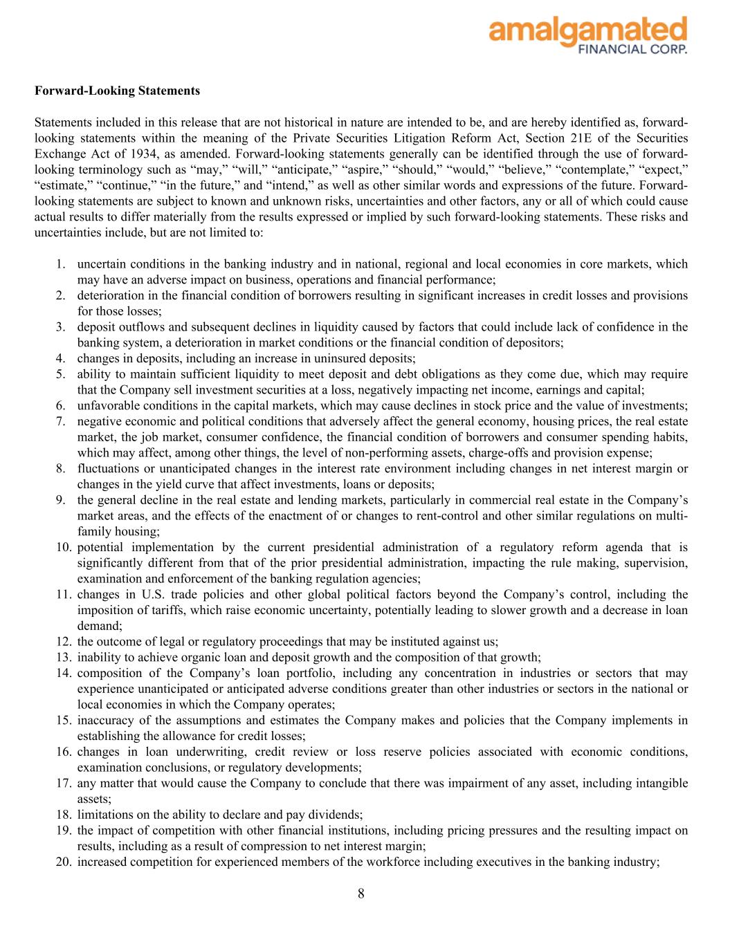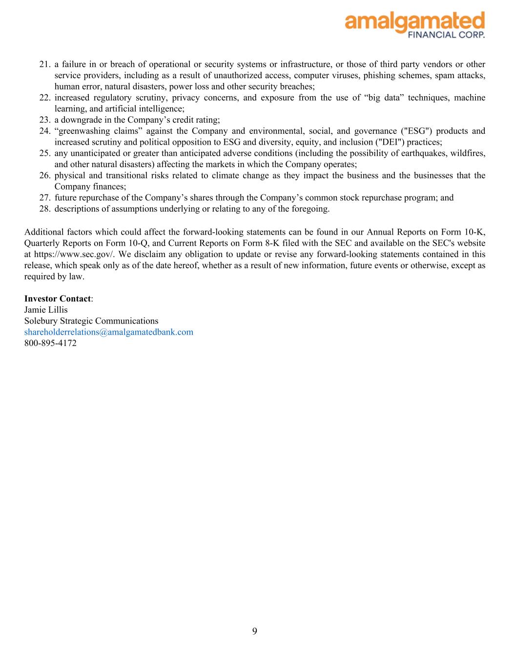 21. a failure in or breach of operational or security systems or infrastructure, or those of third party vendors or other service providers, including as a result of unauthorized access, computer viruses, phishing schemes, spam attacks, human error, natural disasters, power loss and other security breaches; 22. increased regulatory scrutiny, privacy concerns, and exposure from the use of “big data” techniques, machine learning, and artificial intelligence; 23. a downgrade in the Company’s credit rating; 24. “greenwashing claims” against the Company and environmental, social, and governance ("ESG") products and increased scrutiny and political opposition to ESG and diversity, equity, and inclusion ("DEI") practices; 25. any unanticipated or greater than anticipated adverse conditions (including the possibility of earthquakes, wildfires, and other natural disasters) affecting the markets in which the Company operates; 26. physical and transitional risks related to climate change as they impact the business and the businesses that the Company finances; 27. future repurchase of the Company’s shares through the Company’s common stock repurchase program; and 28. descriptions of assumptions underlying or relating to any of the foregoing. Additional factors which could affect the forward-looking statements can be found in our Annual Reports on Form 10-K, Quarterly Reports on Form 10-Q, and Current Reports on Form 8-K filed with the SEC and available on the SEC's website at https://www.sec.gov/. We disclaim any obligation to update or revise any forward-looking statements contained in this release, which speak only as of the date hereof, whether as a result of new information, future events or otherwise, except as required by law. Investor Contact: Jamie Lillis Solebury Strategic Communications shareholderrelations@amalgamatedbank.com 800-895-4172 9