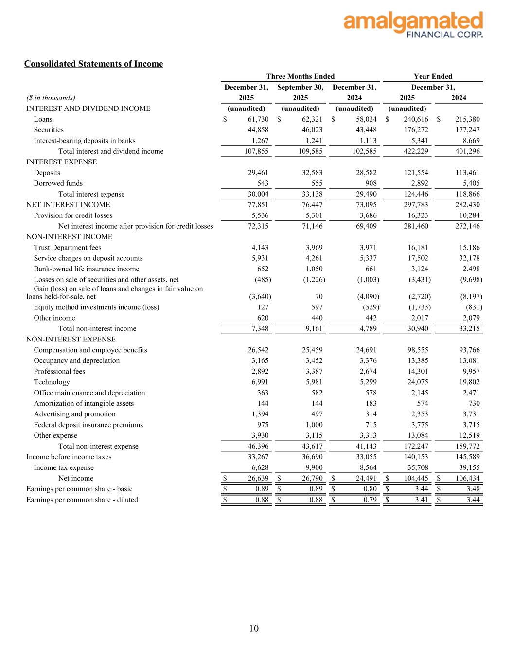 Consolidated Statements of Income December 31, September 30, December 31, December 31, ($ in thousands) 2025 2025 2024 2025 2024 INTEREST AND DIVIDEND INCOME (unaudited) (unaudited) (unaudited) (unaudited) Loans $ 61,730 $ 62,321 $ 58,024 $ 240,616 $ 215,380 Securities 44,858 46,023 43,448 176,272 177,247 Interest-bearing deposits in banks 1,267 1,241 1,113 5,341 8,669 Total interest and dividend income 107,855 109,585 102,585 422,229 401,296 INTEREST EXPENSE Deposits 29,461 32,583 28,582 121,554 113,461 Borrowed funds 543 555 908 2,892 5,405 Total interest expense 30,004 33,138 29,490 124,446 118,866 NET INTEREST INCOME 77,851 76,447 73,095 297,783 282,430 Provision for credit losses 5,536 5,301 3,686 16,323 10,284 Net interest income after provision for credit losses 72,315 71,146 69,409 281,460 272,146 NON-INTEREST INCOME Trust Department fees 4,143 3,969 3,971 16,181 15,186 Service charges on deposit accounts 5,931 4,261 5,337 17,502 32,178 Bank-owned life insurance income 652 1,050 661 3,124 2,498 Losses on sale of securities and other assets, net (485) (1,226) (1,003) (3,431) (9,698) Gain (loss) on sale of loans and changes in fair value on loans held-for-sale, net (3,640) 70 (4,090) (2,720) (8,197) Equity method investments income (loss) 127 597 (529) (1,733) (831) Other income 620 440 442 2,017 2,079 Total non-interest income 7,348 9,161 4,789 30,940 33,215 NON-INTEREST EXPENSE Compensation and employee benefits 26,542 25,459 24,691 98,555 93,766 Occupancy and depreciation 3,165 3,452 3,376 13,385 13,081 Professional fees 2,892 3,387 2,674 14,301 9,957 Technology 6,991 5,981 5,299 24,075 19,802 Office maintenance and depreciation 363 582 578 2,145 2,471 Amortization of intangible assets 144 144 183 574 730 Advertising and promotion 1,394 497 314 2,353 3,731 Federal deposit insurance premiums 975 1,000 715 3,775 3,715 Other expense 3,930 3,115 3,313 13,084 12,519 Total non-interest expense 46,396 43,617 41,143 172,247 159,772 Income before income taxes 33,267 36,690 33,055 140,153 145,589 Income tax expense 6,628 9,900 8,564 35,708 39,155 Net income $ 26,639 $ 26,790 $ 24,491 $ 104,445 $ 106,434 Earnings per common share - basic $ 0.89 $ 0.89 $ 0.80 $ 3.44 $ 3.48 Earnings per common share - diluted $ 0.88 $ 0.88 $ 0.79 $ 3.41 $ 3.44 Three Months Ended Year Ended 10